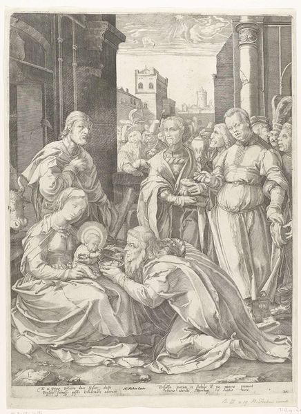Curator: Oh, this print just radiates history. Here we have "Presentation in the Temple," an engraving crafted in 1638 by Paulus Pontius, currently residing here at the Rijksmuseum. What catches your eye about it? Editor: It has such an organized, classical composition and this very contained kind of emotion; I feel that if there was more contrast between light and dark here, that drama could have maybe come through a bit more potently. Curator: Pontius, engraving from a painting by Rubens, excelled at capturing the master’s dramatic flair. See how he orchestrates the scene? The architecture is grand, supporting characters frame the key moment. It’s almost like staging for maximum impact. Editor: Absolutely. And that careful organization reflects Baroque principles; yet that regular light flattens the depth which I would suggest is contradictory. The architectural space seems more compressed because of the relative homogeneity in texture, too. What are we to read in that? Curator: Hmmm. To me, that even light draws all eyes to baby Jesus, highlighting him, literally bringing him "to light". Think of what this tiny baby symbolizes—hope, a new covenant. It speaks to both an ending and a new beginning, and Pontius wanted that plain as day for everyone, I suspect. Editor: Fascinating. Thinking structurally, it feels the composition, with the arching architecture mirroring figures, is designed to keep our focus from wandering out of the piece's conceptual "circle". But if the light feels too even and renders figures more one-dimensional rather than realistically dimensional, maybe what we're to realize is we are encountering a surface rather than being allowed a kind of naturalistic pictorial illusion. Curator: I like the thought of surface; engraving’s always like, "Hey, I'm a surface, too!" Makes me think about the act of witnessing, how Pontius's work creates an emotional record. After all, as a print, the image of Christ in the Temple, multiplied through generations, each becomes a singular artifact of a singular faith...it’s a rather moving thought! Editor: Indeed. Thanks, that's shifted my perspective on this piece considerably!