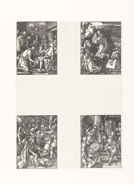 Martin Speer created this work, "Holy Family, Anna and Maria, Christ on the Cross and Joseph with Child," sometime before his death in 1765. Executed with ink on paper, the composition is divided into four distinct scenes that draw the eye across its surface. The use of tight, controlled lines gives form to each religious vignette, yet the overall arrangement resists a singular narrative focus. Speer’s choices in composition invite us to consider how meaning is constructed through juxtaposition and contrast. Take, for example, the varying shapes—rectangles alongside an oval—which create a visual rhythm that is both ordered and unpredictable. This reflects a broader Baroque interest in complexity and the blending of different elements to create a dynamic viewing experience. Speer's print functions not merely as a religious artifact, but as an exploration of form and structure, reflecting how artists of the period engaged with the interplay between established themes and innovative visual arrangements. The piece invites us to actively participate in making meaning.