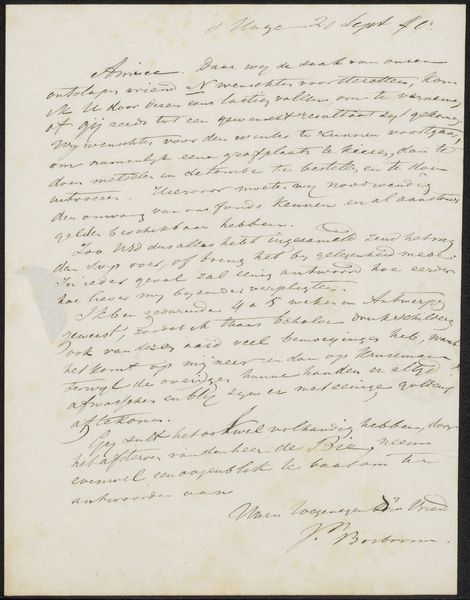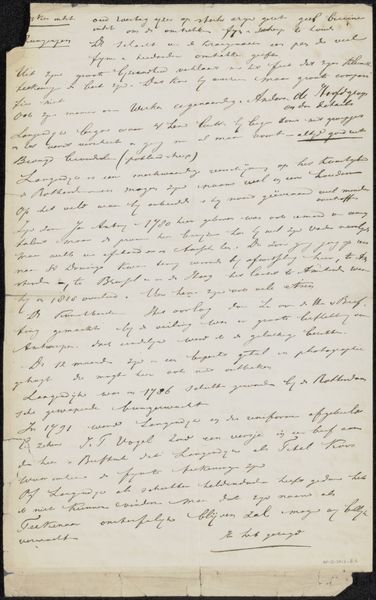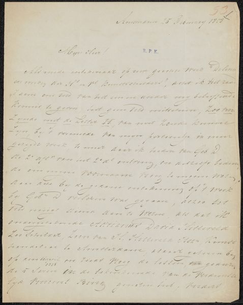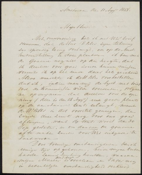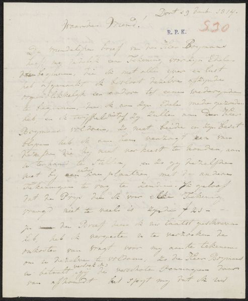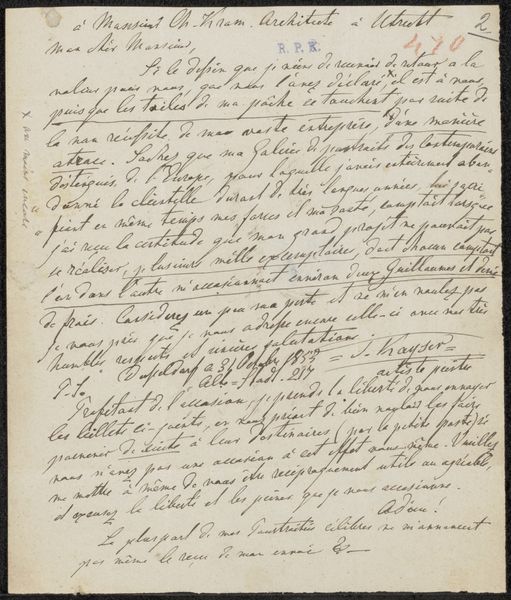 Curator: We’re looking at "Brief aan Frans Buffa en Zonen" (Letter to Frans Buffa and Sons) by David Bles, possibly dating to 1862 or 1863. It’s currently held in the Rijksmuseum. Primarily ink on paper, a drawing, showcasing quite prominent calligraphy. What’s your first reaction to this document? Editor: A sense of intimacy. The handwriting, the personal tone… it feels like we're eavesdropping on a private correspondence. Curator: Precisely. Bles, as a prominent genre painter, was deeply embedded in the art world of his time. This letter likely relates to his dealings with Frans Buffa en Zonen, a well-known art dealership. The Rijksmuseum is a fitting place to preserve these artistic letters. They can offer insight into art’s public role, but more interestingly they offer primary evidence to commercial artistic circles and artistic agency. Editor: The calligraphy itself is striking. The elegant flourishes and varying line weights create a beautiful visual rhythm. The R.P.K at the top right and signature at the bottom each reveal important details. Is there a cultural significance to this style of script that we're seeing here? Curator: Absolutely. During the 19th century, handwriting was a highly valued skill and a reflection of one’s education and social standing. Calligraphy was more than just writing; it was a form of self-presentation and societal adherence. A careful, practiced hand was the equivalent of professional networking and the contemporary email or memo. Editor: I notice, even without fully understanding the text, that there seems to be an emotional appeal or urgency here. The repetition of certain letterforms creates an almost desperate rhythm… it makes you wonder what pressing matter Bles was addressing. Curator: Indeed. Archival finds often prompt more questions than answers. That sense of longing is perhaps something everyone can still relate to today. Editor: Examining art such as Bles’s letters transforms our perspective, illuminating how symbolism transcends specific artwork into something collectively understandable and shared. Curator: Precisely. I feel like these intimate archival finds transform and make sense of public art spaces like the Rijksmuseum.