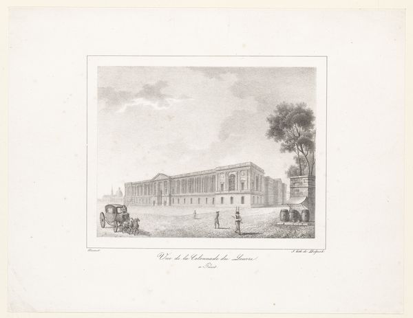Editor: Here we have Jean-Baptiste Arnout's 1820 engraving, "View of the Hôtel de la Marine from the Tuileries Terrace." It's a rather stately cityscape. Something about the muted tones and careful rendering of the architecture gives it a very formal, almost aloof, quality. What's your read on this piece? Curator: Aloof is a great word. It feels very considered, very much about capturing a specific moment of civic pride and order. It's like looking at Paris through the lens of Neoclassical ideals, wouldn’t you say? There is such calm to it, and a real embrace of classical proportion, with those meticulous engravings defining the buildings’ structures. Do you see how the artist employs a certain atmospheric perspective to push back the distant skyline, too? Editor: Definitely, that sense of distance is key. And, the way the figures are included – almost as afterthoughts. Curator: Precisely! They are merely staffage, tiny representatives, really, of humanity's presence rather than the subject itself, in contrast to the dominating architecture. Think of the grand narratives, the empires of the era… The H\u00f4tel de la Marine, with its impressive façade, speaks to a sense of unwavering permanence and power. Almost like a stage. It does, doesn't it? Editor: I see what you mean! So, it's less about the individuals and more about the stage upon which they act? It’s history being made, or *about* to be made. Curator: Absolutely. The city itself is the protagonist here, forever etched in time, unyielding, observing… and the passers-by, bless them, are simply momentary actors on this glorious, architectural stage. A humbling thought, eh? Editor: It is. I never would have looked at it that way on my own. I was too focused on the building itself. Now I realize how every element contributes to this… this sense of enduring civic identity.