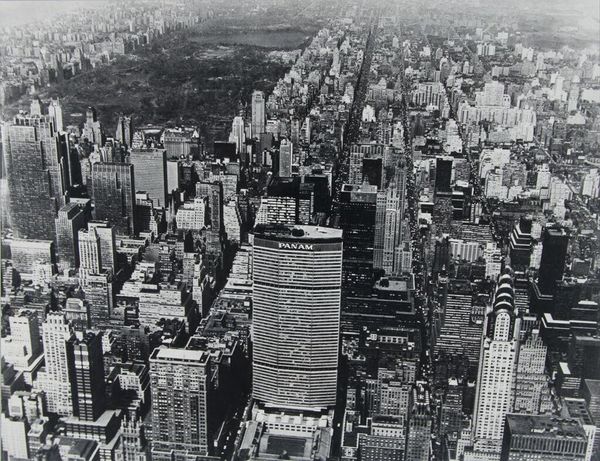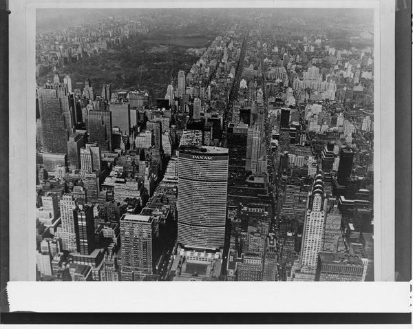 Editor: This aerial photograph, *Pan American World Airlines Building, New York City*, shows a dense cityscape, and the now former MetLife building dominates the view. What does this image tell us about the city at the time? Curator: It’s a fascinating document of mid-century urban aspiration and corporate power. The Pan Am Building itself, later the MetLife Building, physically embodies these forces. How does its prominent placement in the photograph affect our perception? Editor: I guess it suggests the building was meant to be seen as a landmark, an icon of American industry. I hadn’t thought of it that way before. Curator: Exactly. And consider the social impact. The building faced criticism for disrupting views and overshadowing iconic landmarks. This photograph inadvertently captures that tension, doesn’t it? Editor: It does. Seeing it framed as a historical moment rather than just a building gives me a fresh perspective.