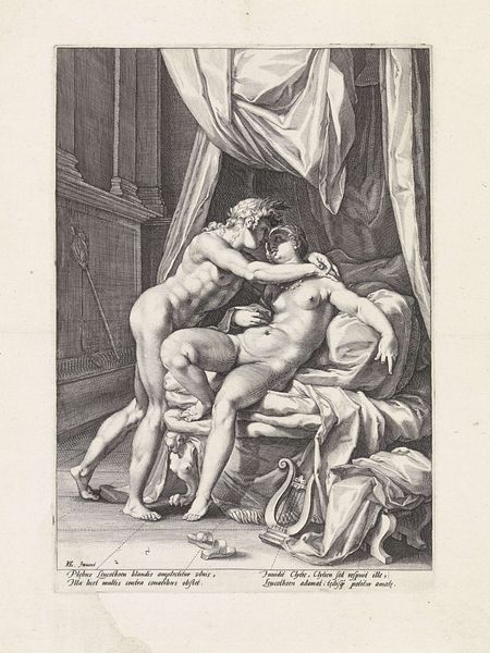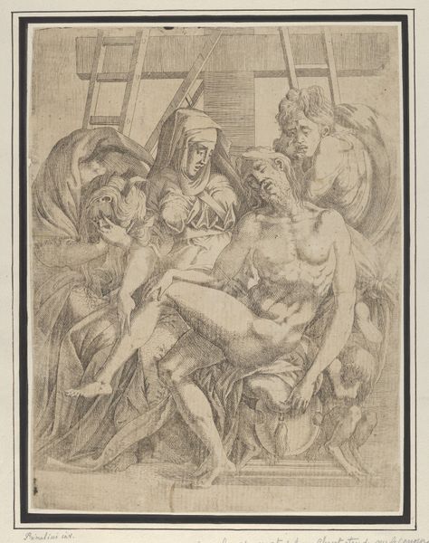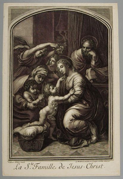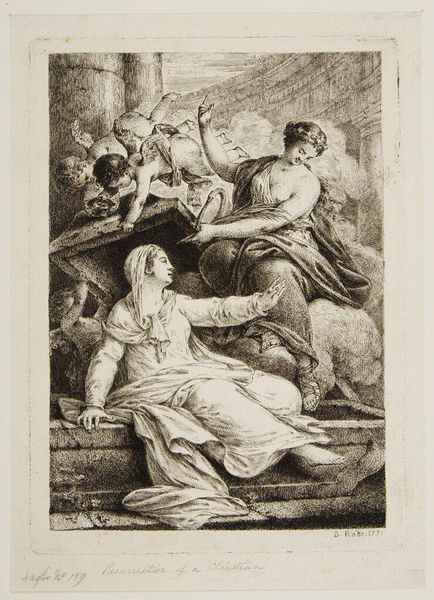 Curator: Here we have François Tortebat’s print, “Death of Mary Magdalen,” held by the Harvard Art Museums. The medium, etching, allows for incredibly fine lines. Editor: There's such a dreamy quality to this; she seems to float between worlds, doesn't she? Like a beautiful Ophelia. Curator: The composition directs our attention to Magdalen's languid pose, while the angels and skull beside her introduce a meditation on salvation and morality. Editor: That skull adds such a stark contrast to the ethereal scene. It's a reminder of mortality amidst all this heavenly grace. Curator: The etching technique itself—all those cross-hatched lines—allowed Tortebat to carefully control the shadows and the textures. Editor: It really does create such a sense of depth and drama. It's a story etched in light and shadow. Curator: A prime example of how material processes intersect with the subject matter in art of this era. Editor: A poignant dance between life, death, and eternal longing, perfectly captured.
