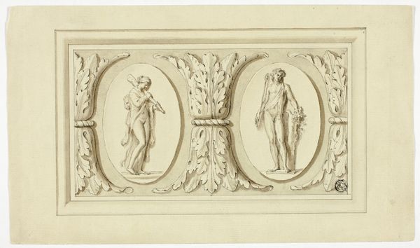 Curator: The artwork presented before us is a "Design for Andirons," created between 1770 and 1795 by Jean Louis Prieur le Jeune. It's currently held at the Metropolitan Museum of Art. It feels like such a measured, formal design. What can you tell me about how we might interpret such an image? Editor: What strikes me first is the bilateral symmetry and clean lines. The rendering is so precise. What do you see when you look at it from an art perspective? Curator: Considering its intrinsic qualities, let's observe how Prieur utilizes form. The geometric components—cubes, cylinders, and spheres topped by what appear to be stylized pineapples—are rendered in a way that suggests mass, stability. Editor: How do the lines influence that sense of stability? Curator: The linearity dictates the clarity of form; note the precision of each contour. We see how he carefully modulated tonal values to depict shadow and volume. These formal choices, I believe, are crucial to appreciating the design's architectural integrity. Do you see what I mean? Editor: Yes, absolutely. It is fascinating how the design, while relatively simple in its components, creates a complex visual experience due to the precision of line and shading, which adds such depth to a rather restrained work. Curator: Precisely. Prieur masterfully orchestrates these basic geometric units into a visually harmonious design. Note the proportional relationships between the base, the central panel, and the crowning elements. The linear elegance speaks to a careful consideration of neoclassical ideals. Editor: It’s like a miniature architectural study, all about proportion and form. I hadn’t really considered it that way at first! Thanks. Curator: Indeed. Thinking through this approach has changed my perspective too!