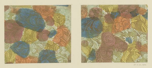 Curator: Here we have "Printed Textiles," a c. 1936 watercolor, textile, and drawing on paper by Suzanne Roy. Editor: What strikes me immediately is this tension between vibrancy and restraint. The botanical motifs are rendered in such saturated blues and reds, but the muted backdrop seems to pull them back. Curator: It’s interesting to consider this as a commercial piece; textile design really comes down to balancing aesthetic appeal with practical considerations of production, wouldn't you say? The materials employed would affect both the cost and durability. Watercolor allows for precise renderings, but how does that translate onto fabric, and what kinds of dyes and printing processes would have been viable then? Editor: Right, the commercial aspect! And yes, these flowers, some I don’t recognize, aren’t just decoration; they carry layers of symbolic weight, even in 1936. The choice of blooms, the arrangement, each speaks to an intended market. Those dark red flowers, are they carnations, perhaps? Carnations had a complicated Victorian history of love, fascination, or refusal… What emotional story is embedded here? Curator: Precisely. Looking closely at the paper, you can see where she’s layered the watercolor to build up those deeper tones. Each layer requiring time and consideration. Time and consideration someone would have had to pay for. This contrasts sharply with machine-printed textiles becoming commonplace in the early 20th century and calls to mind earlier hand-crafted modes of textile creation. I am interested in how Roy navigated a space that was once artisanal but being pushed into something mechanized and manufactured on a grander scale. Editor: Absolutely, and that brown wash background? Is it intentionally aged or antiqued? Because in some ways that adds a kind of depth but equally feels modern when viewed in today's lens. A longing for nature and naturalism perhaps during that pre-war period. These motifs could mean a deliberate yearning for something permanent, or classically beautiful, even. Curator: I find it compelling to examine how Roy negotiates both artistic expression and mass appeal given her design was always destined for practical purposes in peoples homes. Editor: And ultimately those purposes reflect something deeper about our cultural memory. Suzanne Roy's textile patterns provide such fascinating food for thought regarding meaning behind beauty!