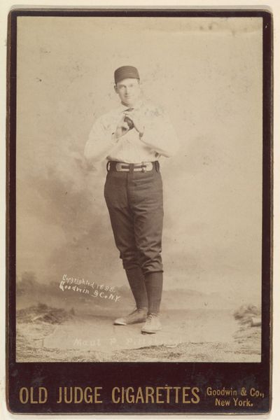 Editor: Here we have "Al Maul, Pitcher, Pittsburgh," a baseball card print from 1888 by Goodwin & Company. The sepia tones give it a really antique feel. The figure's pose seems staged but dignified. What compositional elements stand out to you? Curator: I find the contrasting textures most compelling. Observe the sharp, almost clinical, clarity of Maul's face against the soft, almost painterly, background. This interplay between the distinct subject and the blurred environment creates a visual hierarchy. Editor: So, the contrast isolates Maul. I also notice the figure bisects the composition, is this important? Curator: Precisely. This central alignment reinforces the subject's prominence and authority. Furthermore, note the repetition of geometric forms: the rectangular shape of the card itself, echoed in Maul's stance, creates a sense of formal unity. The figure is, architecturally speaking, "framed." Editor: But what does the advert text at the bottom bring to it? The "Old Judge Cigarette Factory" feels a bit disruptive. Curator: Ah, that's the visual friction. Semiotically, it interrupts the potentially heroic image with a reminder of commerce. The sharp lines of the lettering are in direct contrast to the faded, softer elements of the image, further creating that formal disharmony. It compels the viewer to reconcile seemingly competing languages. Editor: It’s interesting to think of advertising as contributing, or perhaps undermining, the other visual components in that way. Thanks. Curator: Indeed, and through this tension, a richer narrative emerges—one that speaks to the intersection of celebrity, commerce, and representation in late 19th-century America.