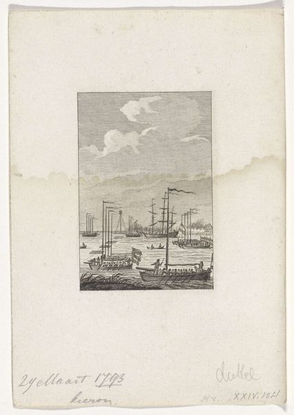 Reinier Vinkeles created this engraving, Bombardment of Maastricht, in 1793. Immediately, the eye is drawn to the structured composition, where the city is rendered with a precise arrangement of lines and shapes. The plumes of smoke punctuate the skyline, introducing a visual rhythm that complicates the otherwise orderly layout of the urban space. The formal structure of the print invites us to consider its semiotic content. The bombardment is not depicted with sensational drama but with an almost detached observation. This can be interpreted as an engagement with Enlightenment ideals, where reason and order are imposed on the chaos of conflict. The artist uses line and perspective to create a sense of depth and distance. The orderly ranks of soldiers in the foreground contrast with the urban destruction of the city, highlighting a tension between the micro and macro of human events. This echoes a broader philosophical inquiry into the nature of violence and its impact on society.