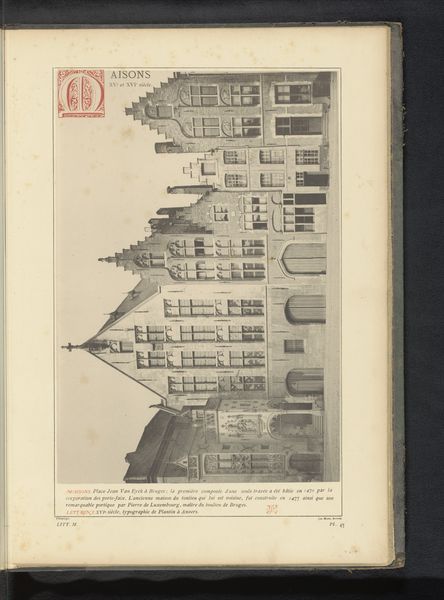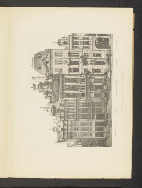 Curator: Let's turn our attention to "Gezicht op de beurs van Lille," a print depicting the Lille stock exchange from before 1880. It’s created with a blend of photography and engraving, capturing a detailed cityscape. What's your immediate impression? Editor: My first thought is how solid, even imposing it feels, yet also very fragile as a memory preserved in ink and paper. The angles, textures, all point to resilience. Curator: Precisely. This image taps into our collective memory of urban centers, highlighting the exchange as more than commerce; it's a vital organ. The structure’s rigid form suggests stability and endurance, values prized by mercantile societies. But do you notice how the engraving almost softens the photographic realism? Editor: I do. It’s fascinating how the combination of techniques blurs the line between objective record and idealized image. It brings forth a kind of cultural placemaking. This reminds me that images like this served as a tool of promotion and pride for Lille. A testament to its economic prowess. Curator: That's an insightful point. The composition itself encourages the reading of a hierarchy: The building dominates, symbolizing order. But let’s not overlook the implied human presence, suggested by the scale of the architectural detail, speaking volumes about societal aspirations embedded within. Do you find yourself ascribing emotions to a structure through image and symbol? Editor: Absolutely! And it goes both ways, too. This print might evoke a feeling of civic responsibility and economic enterprise. This image, by its nature, carries these ideological components. Images construct collective identity and shape our understanding of history. Curator: It makes me think about the passage of time. Today, in our digital landscape, what symbols of resilience are we creating for future generations? Editor: That’s a pertinent question. As image technologies rapidly change, how do we guarantee authenticity or veracity to future audiences interpreting our built and mediated environment? Something for us all to ponder long after we've left this exhibition.