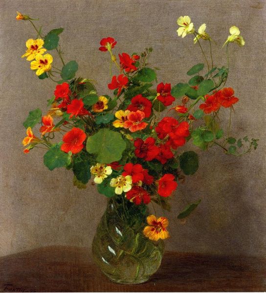 Editor: Here we have Odilon Redon’s “Geraniums,” created around 1902 using coloured pencil. It's... well, it’s quite simple, almost stark in its presentation. What do you see in this piece, beyond a pretty potted plant? Curator: I see a quiet revolution. Think about Redon’s context – a late 19th, early 20th century art world obsessed with rigid academic standards or fleeting impressions. But what does Redon give us? A commonplace object rendered with dreamlike, almost subversive softness. He’s choosing the domestic, the personal, over grand narratives. Editor: Subversive softness, I like that. The bright geraniums pop so vividly. Curator: Precisely. It’s not merely representational, is it? It speaks to a deeply interior experience. The choice of colored pencil adds to that intimacy; it feels like a whispered secret compared to the bold pronouncements of oil paint. How might we connect this to societal expectations around, say, femininity, during this era? Editor: It's almost like elevating the everyday domestic scene, things women were often confined to... giving them significance, saying they matter? Curator: Exactly. And what does it mean to find power in these spaces, in these “minor” subjects? Redon is challenging hierarchies of value. He invites us to find beauty and perhaps resistance, in the unassuming. Editor: I never would have looked at a drawing of geraniums and thought about resistance before. Curator: That’s the power of art, isn’t it? To reveal the hidden layers of meaning beneath the surface. Redon encourages us to challenge assumptions and consider the narratives we often overlook. Editor: This piece makes so much more sense now; thanks for shedding new light.