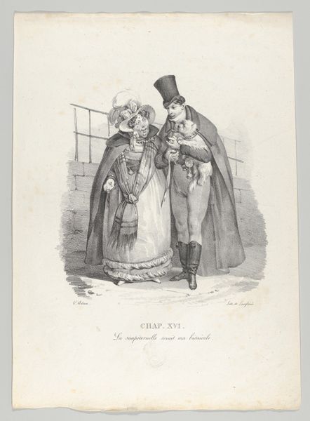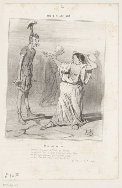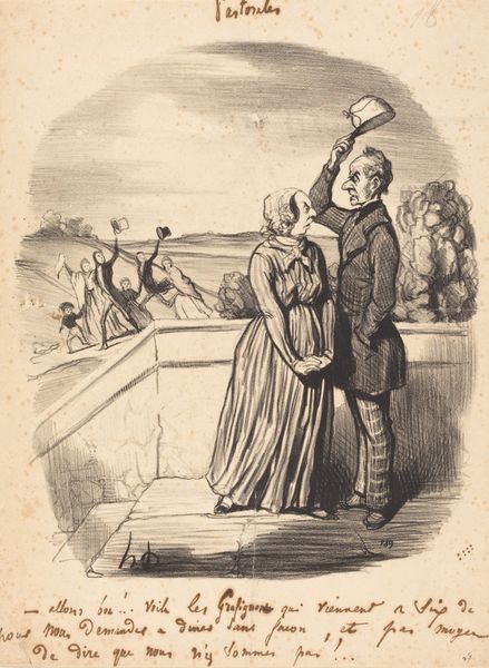 Curator: This lithograph, dating from the 19th century, is by Honoré Daumier. Its title translates to "What, Adelaide, you've bought another… hat…" Editor: The contrast between the frantic, scratchy lines of the figures and the stark white of the background immediately gives a feeling of domestic unease, that sharp back and forth many experience behind closed doors. Curator: Indeed. Daumier was known for his caricatures, his scenes of everyday life infused with social commentary. Here, it appears the subject is consumerism. We see a couple, the woman likely Adelaide, being confronted about yet another hat purchase. The work really invites an exploration into the values assigned to certain objects during that period, as well as an inquiry on class. Editor: The repetition of lines in the woman's bonnet and dress—the layers and curves—evokes this sense of being wrapped in fabric, swaddled in this culture of consumption; a visual prison built of cloth. Also the dark heavy shape in the man's hands and under his arm -- the accusation has a form. Curator: The hat does become almost totemic. Daumier uses lithography—printing from a stone—to capture nuanced details that speaks to the realities of labor and industrialization. Each stroke made contributes meaning, exposing the economic underpinnings of the scene. He is suggesting an entire structure through these characters in the throes of a monetary dispute. Editor: And isn't it fascinating how clothing takes on such symbolic power, becoming not just a garment, but a signifier of identity, wealth, and even discord? Daumier skillfully depicts how such an everyday object—a hat—can trigger such a loaded exchange. Curator: It’s a clever way to portray shifting social mores related to class and gender roles within burgeoning capitalism. And even consumption in modern times! The details of hat and patterned pants reflect on changing approaches to the very basic elements of existence. Editor: Yes, by giving visual form to that unspoken friction, the endless cycle of acquisition and judgment, it becomes, paradoxically, monumental. A quiet tragedy enacted daily. Curator: Daumier used his artistic abilities to expose such tragedies through, in the means of a quickly reproduced artwork. Something worth pondering when faced with the daily routines that makes up the structure of existence. Editor: An evocative look at a universal theme, rendered through telling visual symbols. An echo that continues to resonate, wouldn’t you agree?
