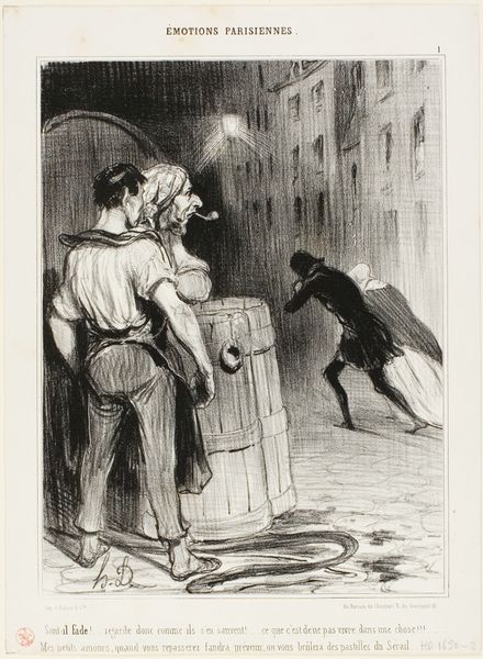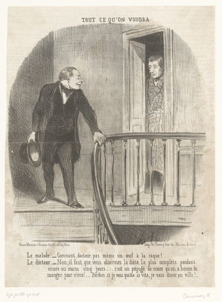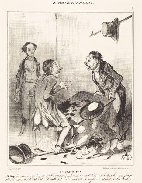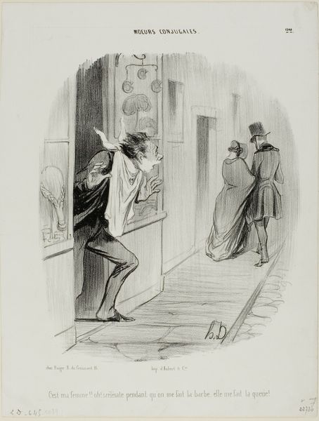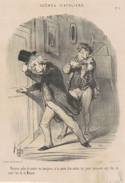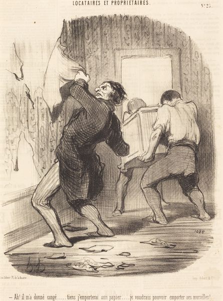 Editor: So, here we have Daumier's lithograph from around the 19th century, titled "La réforme électorale en Angleterre," or "Electoral Reform in England". It feels frantic. All this pushing against the door... what's your read on it? Curator: It feels wonderfully chaotic, doesn’t it? I find myself wondering about that unseen force pushing on the door, presumably "John Bull" himself, as the inscription says. Who is being kept out, and why the drama? This frenzy, captured with such masterful linework, hints at the turbulence surrounding electoral reform at the time. It speaks to me of a world on the cusp of change. Don't you feel the resistance pouring off the page? Editor: Absolutely, the body language is so expressive! I guess I was so focused on the comedic aspect, the almost cartoonish expressions. The title clearly sets the context. Curator: And consider Daumier’s own experiences. As a Romantic artist he injects his beliefs and personal opinions into his artwork, infusing it with emotional energy. This isn't merely a record of an event; it's a feeling, an argument! Isn't it intriguing how humor becomes such a potent weapon for social commentary? Editor: It really is! I initially saw the caricature, but now, seeing how the figures represent such serious resistance, I am understanding its social implications. Thanks for expanding my appreciation of it! Curator: My pleasure! Hopefully it gives you a little glimpse into the soul of a society struggling for its voice.