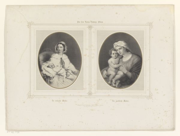 Samuel Cousins created this mezzotint titled "Nature (The Calmady Children)" in the 19th century. During this period, childhood was idealized, often portrayed through a lens of innocence and purity, particularly within bourgeois circles. This work captures two young sisters, their cherubic features and elaborate curls embodying Victorian beauty standards. Yet, this image subtly reflects the socio-economic structures of the time. The girls' clothing, though seemingly simple, speaks to the family's affluence, hinting at the labor and resources required to maintain such an image of domestic tranquility. Cousins, celebrated for his skill in mezzotint, skillfully uses light and shadow to evoke a sense of sentimentality, inviting viewers to reflect on idealized notions of family and childhood that were pervasive in 19th-century society. This sentimental representation offers us an entry point into considering how concepts of nature, class, and identity were carefully constructed and circulated through art.