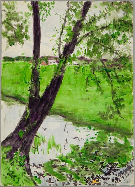 Editor: This is "Landscape with Footbridge and Stream" by Denman Waldo Ross. The luscious greens and textured brushstrokes give it such an immediate, almost tactile quality. What strikes you about the materiality of this painting? Curator: The visible brushstrokes and vibrant pigment draw my attention to Ross's labor, to the very act of making. How does the painting's apparent spontaneity relate to the social context of landscape painting at that time? Editor: That’s fascinating. I hadn't considered the historical context of landscape painting in relation to labor. Curator: Right. Ross seems less concerned with idealized nature than with the physical process of translating a scene onto canvas. We see the means of production, the materiality, on full display. Editor: Seeing it that way, I now appreciate how the visible brushstrokes emphasize the artist's presence and the effort involved in creating the artwork. Thanks for this new perspective.