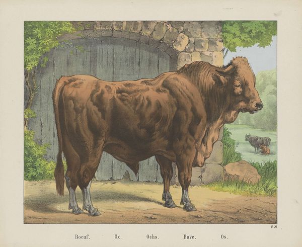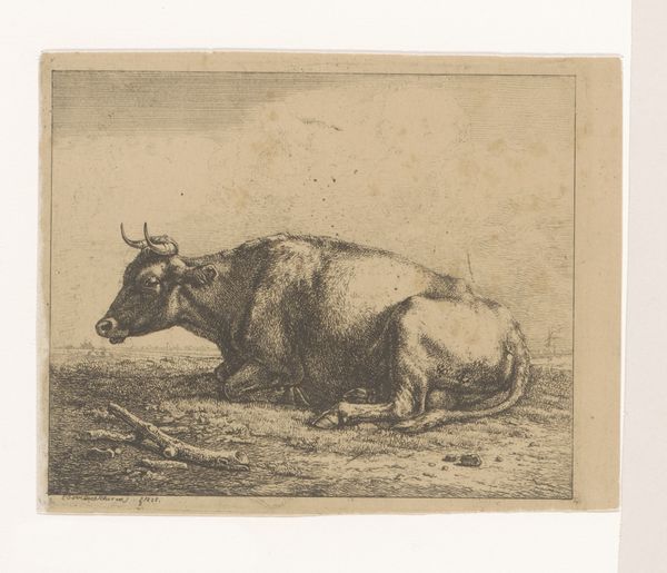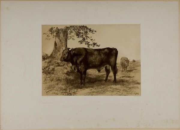 Editor: This is Rosa Bonheur’s "Spanish Bull," a striking print. The bull seems so massive and solid. What can you tell me about it? Curator: Note Bonheur’s focus on the bull's musculature, carefully delineated through the etching process. Consider how the labor of animal husbandry and the materiality of the bull itself were perceived in the 19th century. Editor: So it's not just about the animal, but about how we see its economic value? Curator: Precisely. Bonheur elevates a working animal, prompting us to think about the labor and resources involved. This challenges conventional artistic subjects. Editor: That really shifts my perspective on the artwork. Thanks! Curator: My pleasure! It is important to examine the cultural context when looking at art.