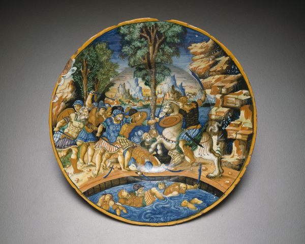 Editor: So, here we have "Plate with Story of Numa Pompilius and Arms of Gonzaga," created around 1560 by Urbino Potteries. It’s a ceramic intaglio, currently at the Art Institute of Chicago. There's something theatrical about it; like a scene frozen from an epic play. What do you see in this piece? Curator: I see a complex negotiation of power and historical narrative, carefully curated for the Gonzaga family. This plate isn't just decorative; it's a carefully constructed piece of propaganda. Consider the choice of Numa Pompilius, the legendary second king of Rome, known for law and peace. Why associate the Gonzaga family, already powerful, with such a figure? Editor: Perhaps they wanted to appear wise and just? Curator: Precisely! This is a deliberate attempt at self-fashioning. It says, "We are not just powerful, we are benevolent rulers, bringing civilization and order.” The Gonzaga family, of course, is strategically placed within this narrative through their coat of arms at the top of the plate. Who commissioned this artwork and how did the plate function within the Gonzaga household? Editor: Maybe to impress guests at their dinners? Were these historical narratives commonly used in such decorations at the time? Curator: Absolutely. These plates, known as istoriato ware, were highly fashionable. Narratives were drawn from classical history, mythology, and the Bible, often subtly reflecting the commissioner’s aspirations and anxieties. Think about the implications – visually consuming history, crafting one's image through the stories one chooses to display. The Renaissance was obsessed with legacy. Editor: It’s fascinating how a seemingly decorative object could be such a potent tool for constructing an image! I had not considered this historical approach, thanks. Curator: Indeed, considering the agency of patrons invites fresh dialogue on the narratives embedded in art and how these stories shape our perception of the past.