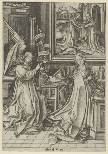 Israhel van Meckenem created this engraving titled 'The Birth of Mary, from The Life of the Virgin'. Observe how Meckenem masterfully manipulates line and space in this print. The composition is intricately divided into distinct areas, each filled with detailed domestic scenes, yet unified by the artist's consistent use of hatching and cross-hatching. This creates a rich, almost tactile texture across the entire surface. The use of linear perspective, though not entirely accurate, draws our eye to the various figures within the room, each engaged in their task, contributing to a complex visual narrative. Meckenem uses architectural elements like the window to frame secondary scenes. This creates a world within a world. The engraving presents a structured view of a significant religious event, inviting us to reflect on the organization of space and narrative within the artwork. This print exemplifies how visual structures can communicate complex cultural and spiritual ideas.