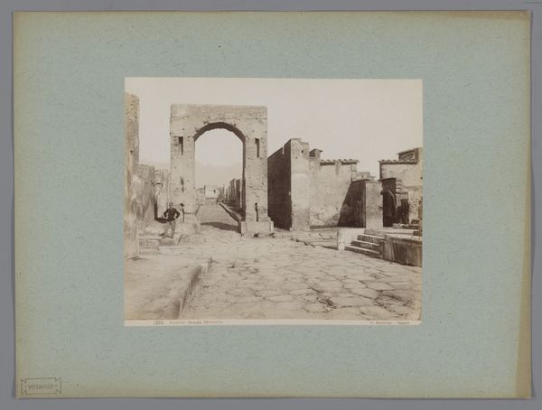 Curator: We’re standing before Giorgio Sommer's "Ruïne van het Teatro Greco in Taormina, Italië," a gelatin silver print made sometime between 1857 and 1914, currently held in the Rijksmuseum collection. Editor: My immediate feeling? It’s profoundly melancholic. Those shattered stones…they speak volumes about the fleeting nature of glory, don't they? Curator: Absolutely. The ruin becomes a potent symbol of temporal decline, echoing the transience of human endeavor. What intrigues me is the way Sommer frames the theater's bones. He presents us with a ghostly cityscape, a stage now only inhabited by echoes. Note the almost clinical quality of the light. Editor: Clinical but strangely romantic. I mean, I feel an undeniable sense of romance, even a touch of drama. Look at the lone figure framed in that central archway. Is that a soul lost in time? It certainly seems staged! Perhaps they were strategically positioned for this very effect of melancholy. Curator: A carefully positioned "genius loci," perhaps? Reminding us that ancient places hold a certain kind of power over us? In a ruin, even chaos contains meaning, doesn’t it? Those scattered blocks tell a story as eloquent as any written history. Editor: Precisely! And you know, thinking of stages, it feels like we're peering into the past as actors in our own present play. Does it influence our view of ourselves and our current predicament somehow, this echo from so long ago? Are we the tiny figures someday soon standing in someone else's romantic view of *our* former glory? Curator: It’s a haunting reminder that we, too, are writing our own histories that will one day stand ruined. The weight of all that has come before bears down. Sommer has created a beautiful meditation on time and legacy. Editor: So much so. It seems it is now my time to meditate on all that has been said here today! Thanks. Curator: Likewise!