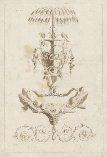 Curator: Looking at this etching, it feels like staring into the mind of someone overflowing with ideas for decoration. Like, imagine this brought to life in gleaming silver... utterly decadent. Editor: Well, "Verscheyde Constige Vindigen om in Gout, Silver, Hout en Steen te wercken (Plate 9)" by Michiel Mosyn offers precisely that peek. Created between 1651 and 1653, it showcases designs applicable to various materials, reflecting the opulent Baroque tastes and artisanal practices of the period. It's currently held at The Met, a testament to its lasting appeal. Curator: Plate 9, huh? Makes me wonder about plates 1 through 8! Baroque, definitely – it's like a sugar rush for the eyes. I am immediately drawn to how symmetry creates rhythm and visual flow through all of these whimsical elements and patterns. Two chubby cherubs almost float across the top edges and a grand design of sweeping organic forms. But what’s this object to begin with? Editor: Exactly! This print was created not to be appreciated just for itself, but as inspiration for artisans and patrons commissioning ornate objects—everything from elaborate furniture to impressive silverware. The aim was functionality: diffusing designs. Etchings, like these, aided greatly in expanding access to luxurious things for anyone with money and desire to commission it. Curator: So, a blueprint for bling! It reminds me how much power patterns held. You see a motif repeated in the palace of Versailles. Next thing you know, it's on every vase in the city. Did owning fancy decorative objects ever help anyone think profound thoughts or lead a noble life? Editor: The proliferation of imagery undeniably shapes our cultural landscape and transmits political ideas. Sumptuous displays of wealth also had clear implications in Early Modern Europe, communicating status. It helped shore up the political systems and the economy, one shiny surface at a time! Curator: True! Perhaps beauty, like this piece, provides joy which can have far-reaching consequences. I would want this above my couch at home, right where I can see it and dream. Editor: Indeed, thinking about this as a democratizing tool adds a layer of richness. We have to acknowledge Mosyn’s work facilitated, and complicated, the way art functions within society. Curator: I wonder how Mosyn would feel about us discussing his intent and the objecthood of art hundreds of years after his piece was printed. Editor: Undoubtedly amazed at the transformation in reception, but the impact would surely gratify him.