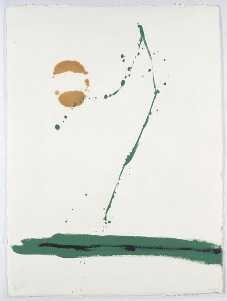 Curator: Adolph Gottlieb's "Blues on Green" presents a striking visual dichotomy. Editor: My first thought is the tension between the serene blue and that aggressive, dark splatter. Curator: Precisely. The composition hinges on this visual relationship. We see Gottlieb’s use of opposing forms creating a dynamic interplay. Editor: It's interesting to consider his process. Was this carefully planned, or more about a spontaneous gesture, allowing the paint's inherent qualities to dictate the outcome? Curator: The arrangement of these forms—a diffused circle hovering above a more chaotic mass—establishes a clear visual hierarchy. It suggests a symbolic ordering. Editor: Right, the texture of the blue, almost hazy, makes me think of spray paint on a raw canvas. Did the making of the piece influence Gottlieb's approach to form? Curator: Ultimately, "Blues on Green" invites contemplation on the power of simple forms to convey complex emotions. Editor: A great encapsulation. Thinking about the materials and gestures involved makes it even more thought-provoking.
