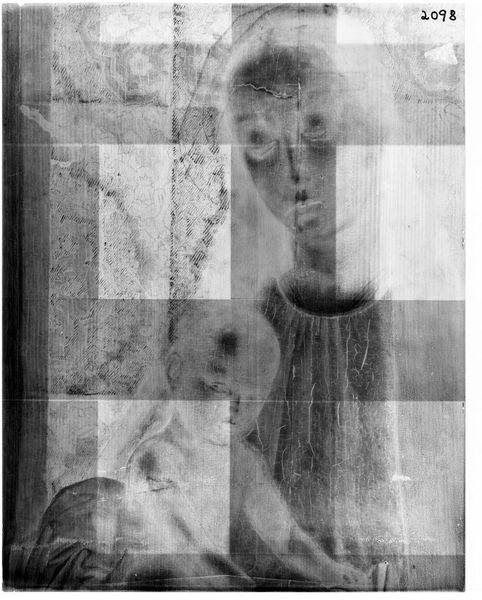 Curator: This is an X-radiograph of "Virgin and Child with St James," originally by Andrea Previtali. The image comes to us from the Harvard Art Museums. Editor: My first impression is of layers, and a kind of haunting exposure of the artwork's skeleton, stripping away the surface to reveal the underlying structure. Curator: Precisely. X-radiography allows us to peer beneath the visible surface, exposing the artist's process, earlier versions, or later restorations. Think of it as a visual metaphor for unveiling hidden histories. Editor: It makes me think about how even sacred images are material objects, subject to decay and intervention. It challenges the idea of a pristine original, reminding us that art exists in a social and temporal context. Curator: Indeed. The radiographic image itself becomes a symbol—of time, change, and the ongoing relationship between art, science, and cultural memory. Editor: And of how we are constantly re-evaluating and re-interpreting the past through the lens of the present. Fascinating. Curator: It certainly offers a unique perspective on a Renaissance masterpiece.