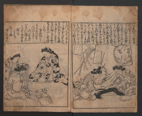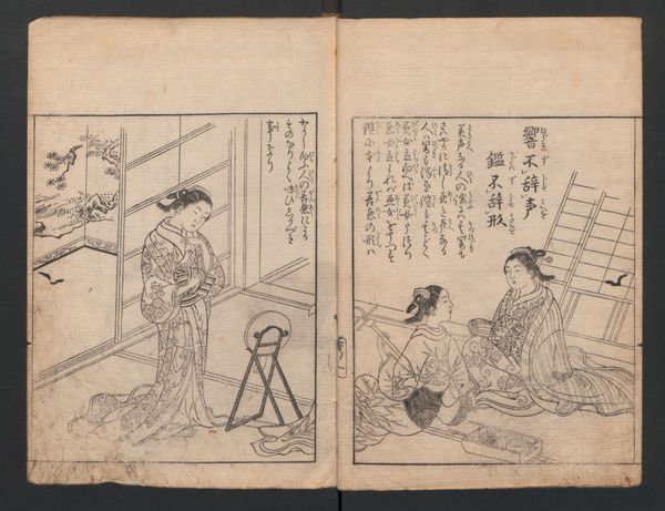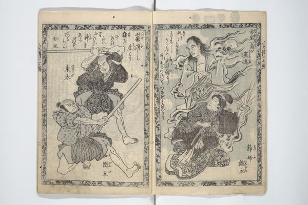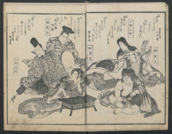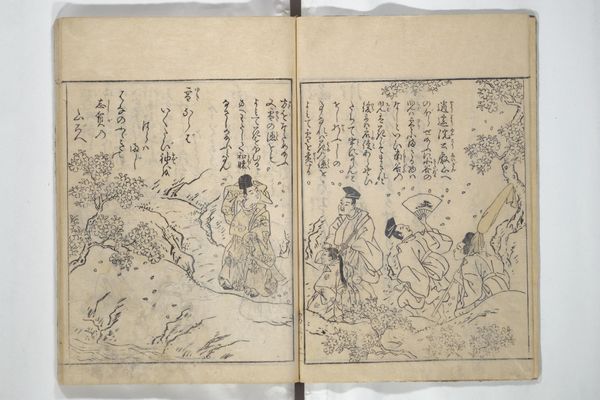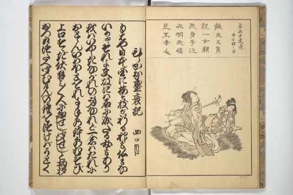 This page of "A Garden of Celebrated Japanese and Chinese Paintings", printed by Ooka Shunboku, features two figures in ink. On the left, a woman is surrounded by piles of paper, perhaps engaged in the act of papermaking or washing. On the right, a man sits formally, adorned in traditional attire. These scenes evoke a sense of everyday life elevated through the artistic process. Consider the act of washing or creating paper. It's an activity that goes back centuries, across cultures, and is imbued with cultural significance. Paper, in particular, has been linked to knowledge, communication, and permanence. This notion of permanence echoes through art history, recalling ancient Egyptian papyrus scrolls as well as modern-day printed works. Looking deeper, these images resonate with a kind of collective memory, a shared understanding of human experience that transcends time. Perhaps Shunboku wanted to highlight the cyclical nature of human life, and to use imagery that speaks to our subconscious desires to communicate across time.