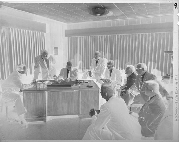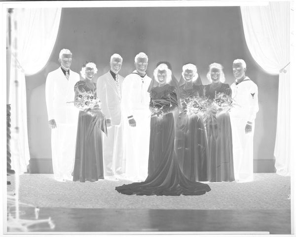 Curator: This gelatin silver print by John Deusing shows students in prom attire seated along the edge of a room. The tonality strikes me first; it's almost ghostly. Editor: Indeed, the inverted contrast contributes to a sense of unease, of a hidden narrative. Observe how the banner, "We Dare to Be Different," speaks volumes about societal pressures. Curator: The careful arrangement, the way their clothes define each figure, speaks to the rituals around social gatherings. Each is a study in form and texture. Editor: And what forms those textures? Hierarchy, expectation, and social performance. I wonder, were these students "daring to be different" in ways that challenged the establishment? Curator: Regardless, there is something both poignant and enduring in Deusing's composition and light values. Editor: Yes, a testament to the photographic medium's power as a time capsule and cultural artifact.