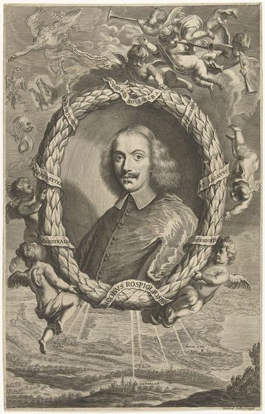 Curator: Before us we have Robert Nanteuil's "Cardinal Mazarin," a striking portrait from the Harvard Art Museums. Editor: The texture is immediately what grabs me. The fur looks so soft, the laurel wreath so precisely rendered. It’s a study in contrasts, softness against hardness. Curator: Absolutely. Nanteuil was the official engraver to Louis XIV, and this portrait captures Mazarin's immense power and influence. The laurel wreath and coat of arms emphasize his stature. Editor: But also, the subtle gradations of light and shadow...see how they define the face, lending it a sense of depth and character. It's masterfully done. Curator: Indeed. Mazarin was a controversial figure, and Nanteuil walks a fine line, presenting him as both powerful and… perhaps a bit weary. Editor: A psychological complexity emerges from this tight composition. It really is a remarkable interplay of technique and subject. Curator: It shows how art is always embedded in historical power dynamics, but also open to formal innovation. Editor: A perfect example of how formal elements contribute to the portrayal of power.