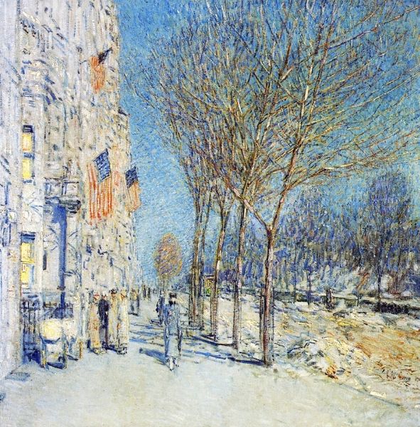 Curator: Armand Guillaumin's 1875 painting, "La Place Valhubert," offers us a slice of Parisian life through the fresh eyes of Impressionism. It's a view of the city painted en plein air, focusing on the play of light and color across the urban landscape. Editor: Immediately, I'm struck by the mood – that hazy, almost melancholic feeling. The bare trees lining the Seine, the soft, diffused light... it speaks of a transient moment, caught just before winter's full arrival. Curator: Indeed, the fleeting moment is key to Impressionism's project. Guillaumin, though somewhat overshadowed by his contemporaries like Monet and Pissarro, was crucial in establishing the movement’s focus on modern life and the effects of industrialization on the environment. Think of the impact the Seine River held in creating industry! Editor: Absolutely. The river, rendered here with swirling strokes of muted greens and grays, carries layers of symbolism, doesn't it? It represents both the lifeblood and the changing face of Paris during this era – movement, industry, but also a sense of perpetual flux. The river can signify the conscious. Curator: And consider the setting, La Place Valhubert, near the Jardin des Plantes. This location held great cultural weight. Depicting it places Guillaumin directly within the urban debates shaping Haussmann's Paris: the creation of public parks, new traffic patterns, and new residential projects for the common people, versus the elite. The choice of where to place your easel speaks volumes about what the artist wants you to see. Editor: The bare trees also seem potent. They carry a sense of dormancy, anticipation. It reminds me of the bare branches in countless Romantic paintings, gesturing toward a spiritual connection between humans and nature, however subtle. Are these early modern artists trying to create the same link using city parks, with trees, and promenades, despite the obvious transformation of the natural environment? Curator: Precisely, and notice Guillaumin's brushstrokes. The rapid, broken marks create a sense of atmosphere. They dissolve the clear forms into a tapestry of color, mirroring the changing atmospheric conditions. This contrasts starkly with the realism of academic art at the time, reflecting a larger socio-cultural shift towards a subjective experience of the world. Editor: So it’s as if Guillaumin offers us more than just a visual representation of Paris. He delivers an emotive, psychological landscape filtered through his own perceptions and infused with symbols suggesting transition. I come away with a feeling of nostalgia. Curator: And I see an effort to democratize what is considered worthy of artistic representation, finding beauty and value in everyday scenes rather than grand historical narratives or aristocratic portraits. Editor: Beautiful. Each encounter peels back a layer to show a dynamic mix of cultural symbols and lived experiences.