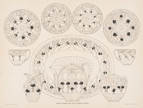 Curator: This intricate ink drawing is titled "Details of a Punch Bowl" and was created around 1936. Editor: Immediately, I’m struck by its delicate formality. The circular layout, the botanical motifs rendered with such precise lines... It evokes a very specific historical mood of upper-class gentility, doesn’t it? Curator: Indeed. What I find compelling is the meticulous craftsmanship—the labor invested in what ultimately remains a design proposal, or perhaps a craftsman’s sample. It blurs the line between artistic creation and functional object production. Who exactly was making these punch bowls, and under what conditions? Were they highly skilled artisans, or subject to the demands of early industrial production? Editor: And it is inscribed. If we read the inscription as integral to the work, rather than just added text, that is what really opens it up. Look – those names are included alongside Latin and decoration. In one section it notes the name "Thomas Darling by his Parents," which feels like it invites reflections on lineage, gift-giving, social circles of that time. This might gesture to the intersection of gender roles, social expectations and class structures in that period. Curator: Precisely! And to expand further: The ink itself speaks to broader histories of trade and manufacturing, connecting back to labor conditions both local and global. The artist would have needed to acquire these tools and skills, making a community of artisans through material practice and their methods of production. Editor: Right, and even the very choice of representing a punch bowl--an object so connected to social rituals and sometimes excesses-- it acts as a comment of sorts. The choice and precision feels loaded, doesn't it? What kind of conversation was Flynn attempting to have with such design? Curator: Absolutely, it suggests a very refined process, and one deeply entrenched in the material culture of the time. Editor: Seeing it like this brings out the complexities of this artwork. Curator: For sure. Examining the method reveals the embedded labour, material sourcing, and potential market surrounding these types of decorations.