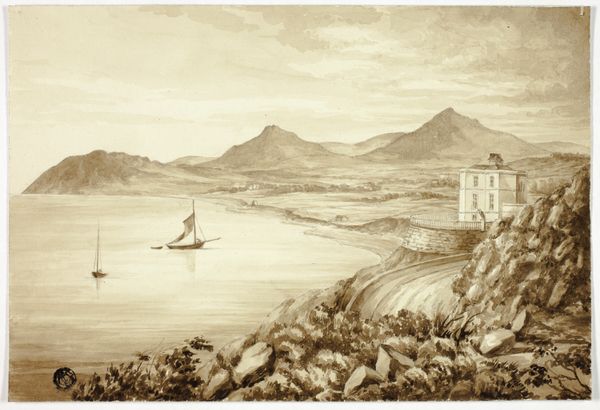 Elizabeth Murray created this watercolor of the Rhine, rendered in a limited palette of neutral tones, sometime in the 19th century. The composition is divided horizontally: the top half captures the sky and distant mountains in hazy, diluted washes, while the lower half depicts a shoreline with architectural structures and figures in more detailed, darker strokes. Murray skillfully uses the formal elements of line and value to guide our eyes through the landscape. The eye moves from the darker foreground up toward the lighter background, which creates an illusion of depth. The artist’s approach evokes a sense of tranquility, a feeling that emerges from the harmony between the landscape's subdued coloration and balanced structure. Note how the artist uses the economy of line, particularly in the reflections on the water, to suggest the ever-changing qualities of light. In its formal and structural emphasis, Murray’s watercolor invites us to contemplate the relationships between observation, representation, and emotional experience.