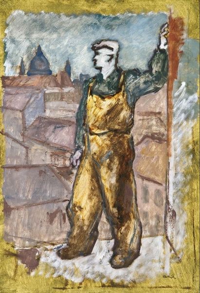 Alfred-Bernard Meyer crafted this enamel plaque titled 'A French Soldier.' The figure strides across our field of vision against a glossy black background, creating a striking interplay between depth and flatness. Meyer's composition uses a vibrant palette, with the soldier's blue jacket and red cap sharply contrasting the earthy tones of his trousers and the landscape underfoot. This contrast, combined with the figure's determined gait, suggests a sense of urgency. Meyer's rendering also plays with texture. He accentuates the roughness of the soldier's garments against the smooth enamel surface, drawing attention to the materiality of the artwork. Through his manipulation of color and texture, Meyer encourages us to consider the symbolic weight of the soldier within the historical narrative of France. It is this tension between surface and depth, figure and ground, that invites us to unravel the rich layers of meaning embedded within the plaque's glossy façade.