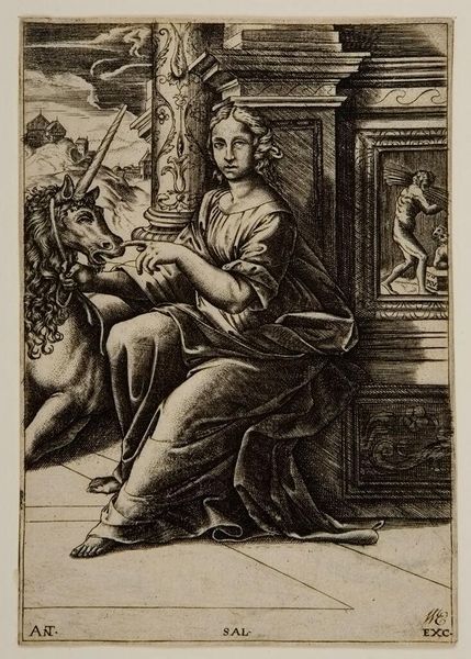 This etching presents us with a Madonna and Child, an echo of antique ideals rendered by Cesare Massimiliano. Note the tender embrace, a visual echo of ancient Roman depictions of maternal love and piety. This motif transcends time, resurfacing in Renaissance art and beyond. The veil, a symbol of modesty and purity, also appears in countless depictions of the Virgin Mary. See how it drapes, reminiscent of classical sculpture, yet imbued with a distinctly Christian sentiment. This image reminds us of humanity’s eternal quest for comfort and reassurance. These symbols are powerful forces, engaging viewers on a deep, subconscious level, evoking a sense of timeless human connection. This symbol of the Madonna and Child is a testament to the non-linear, cyclical progression of cultural memory, resurfacing and evolving across different historical contexts.
