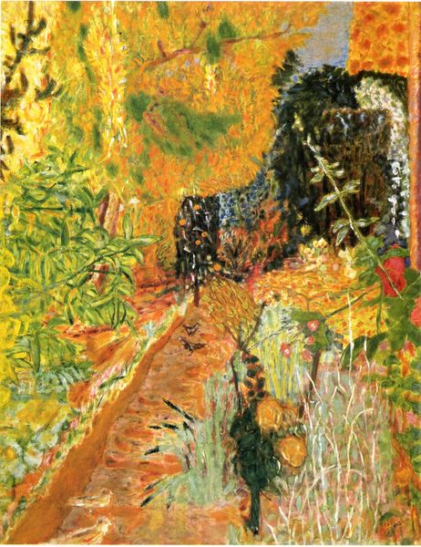 Curator: Wassily Kandinsky’s "Park Von St. Cloud – Herbst I," painted in 1906 with oil on canvas, offers us a view into the artist's early exploration of expressionism through a landscape. Editor: It certainly evokes a feeling, doesn’t it? A certain…melancholy, perhaps? The overwhelming use of warm tones – yellows, oranges, reds – should be cheerful, but there’s an undeniable weight to it. Curator: That weight, I think, stems from the historical context. Kandinsky was on the cusp of a revolutionary shift in art, moving away from representation and toward abstraction. The “Park Von St. Cloud” pieces reflect the moment in which he teetered between these styles, capturing the look of a familiar landscape and charging it with his emotional state through distorted fauvist colors. Considering broader intersectional narratives, it’s poignant because of how it challenges academic conventions and societal expectations regarding acceptable aesthetics. Editor: From my vantage point, I see the institutional narrative emerging even in this transitional phase. Impressionism paved the way, certainly, normalizing plein-air painting. But even the subjects themselves – the park, a well-to-do destination outside Paris – speak volumes about the rise of the bourgeois and their leisure activities, thus solidifying it’s art historical position. The park became an accessible symbol, yet in Kandinsky’s interpretation, it appears fragmented and distorted. Curator: Absolutely, that fragmentation speaks to Kandinsky's deep connection to the spiritual in art, as detailed later in his essay ‘Concerning the Spiritual in Art.’ There is an internal logic governing this external representation of an autumn park. This prefigures Kandinsky's push for abstraction, aiming to create a visual language as powerful as music. Editor: What’s interesting, historically speaking, is that we are looking at the intersection of an emerging public audience, new leisure possibilities, artistic self-expression, and a market keen on showcasing it. Curator: This work invites a profound conversation. Not only concerning artistic innovation but also regarding the political undertones embedded within a seemingly simple landscape and societal accessibility of landscapes. Editor: Indeed, "Park Von St. Cloud – Herbst I" serves as an excellent marker for art's dynamic position within the era.