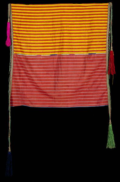 Curator: The "Woman's Blouse," dating to around 1975 and held here at the Minneapolis Institute of Art, is a fascinating example of fibre art, specifically weaving with cotton. Editor: Wow, it's...arresting. A vibrant field of red, softened by those delicate vertical stripes, and then that rainbow collar—it feels both simple and powerfully symbolic. There’s an earthy quality, but also a certain festive, almost regal, aura about it. Curator: It’s an excellent encapsulation of Indigenous American textile traditions. The repetition of pattern, particularly in those carefully placed stripes, speaks to enduring themes in textile design, a legacy and memory embedded within each woven thread. Editor: I'm wondering, beyond the striking visual, what stories it holds? That bright red seems so intentional. Curator: Well, color in Indigenous textiles often holds deep cultural significance. Red, in many traditions, symbolizes lifeblood, power, connection to the earth. The vertical lines themselves might represent growth, spirituality, or even lineage. The colours around the neck suggests both connection to sky and earthly realm. Editor: The craftsmanship seems exceptional. Curator: Indeed. Weaving like this is far from mere craft. It’s a profound expression of identity, cosmology, and the enduring spirit of the Indigenous Americas. A dialogue woven in color and thread. Editor: Makes me reconsider what we classify as ‘art’—versus, say, garment. What boundaries, really, separate utility from deep cultural expression? It’s humbling, really, to look at it like that. Curator: Precisely! The blurring of lines, isn't it wonderful? It serves as a poignant reminder of art's purpose—as a story, as belonging, as something beautiful, of course, but something intensely, unapologetically human.