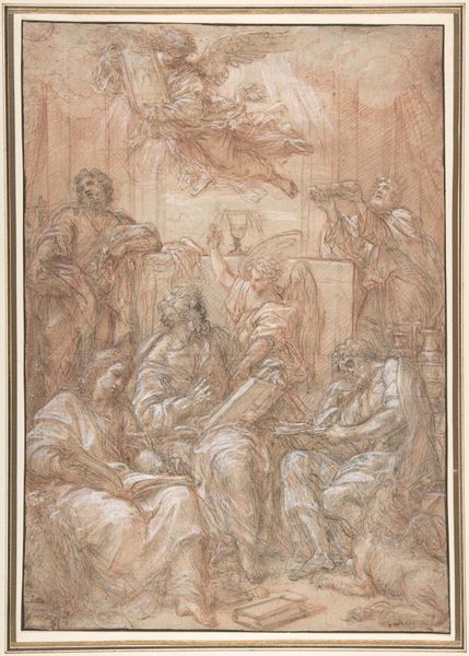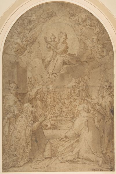 Ciro Ferri created this pen and brown ink with brown wash and white gouache drawing, The Circumcision, in the 17th century. The scene depicts the biblical event of the circumcision of Jesus, framed by an elaborate architectural border. Ferri was an Italian artist working during the Baroque period, a time when the Catholic Church was a major patron of the arts. Religious institutions used art to promote their doctrines, and artists often worked to create images that reinforced these ideas. The composition, with its dramatic lighting and emotional figures, is typical of the Baroque style. The architectural border and cherubic figures suggests its function as a design for an altarpiece. Ferri was closely associated with the workshop of Pietro da Cortona, who was himself inspired by the work of Bernini. By studying drawings like this one, and others by Ferri, scholars can better understand the social and institutional contexts in which art was created during the Baroque era.