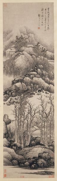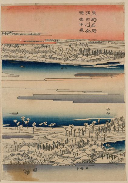 Kobayashi Kiyochika produced this woodblock print, "Inner Valley at Tsukigase," during the Meiji period in Japan, a time of rapid modernization and Westernization. Kiyochika, known for his ability to blend traditional ukiyo-e techniques with Western-style realism, captures a serene winter landscape. The snow-covered scene, with its muted tones and delicate lines, reflects a nostalgic longing for the disappearing natural world amidst industrial progress. The print itself, as a mass-produced medium, sits at an interesting intersection between traditional artistic practices and modern industrialization. As historians, we examine prints like these not only for their aesthetic qualities but also as cultural documents, revealing the tensions and transformations of their time. Further research into the artist's biography and the social context of the Meiji period can reveal the complex relationship between art and society.