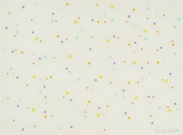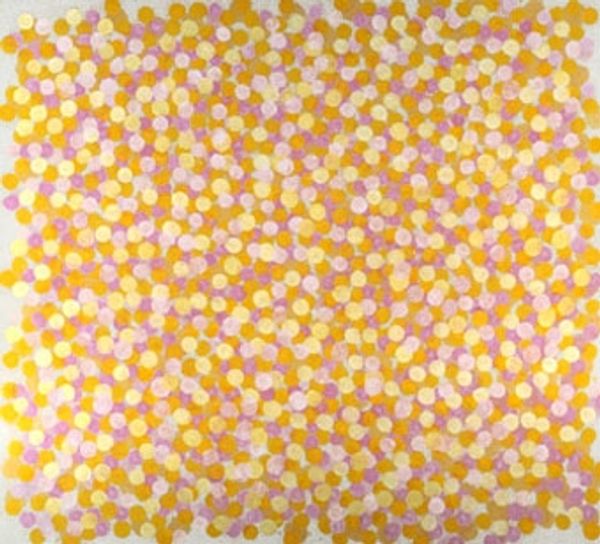 Curator: Up next is "Dots," an acrylic on canvas piece completed by Yayoi Kusama in 2004. Editor: Oh, it's... happy. Irresistibly cheerful. A chaotic explosion of pastel bubbles, if bubbles were more geometric. Curator: That initial reaction is key. Kusama's dots aren't simply decorative; they represent, for her, a manifestation of her own mental state, of obliteration, a strategy to confront her anxieties about infinity and self. Editor: So the relentless repetition isn't just aesthetic, it’s deeply personal and reflects the societal treatment of mental health? How are these kinds of intense repetitive practices treated in institutions? Curator: Precisely. Kusama willingly lives in a psychiatric institution, which also informs the context in which we view this and much of her work. By voluntarily institutionalizing, she contests typical assumptions about patient agency and societal constructions of "madness". We also have to consider the market and institutional embrace of what was initially labeled as 'outsider art'. Editor: And the aesthetic echoes with the 60's counterculture's exploration of psychedelia and expanded consciousness. There’s a vibrant, almost hallucinatory quality to it, but rendered in such clean lines. Did her choice of patterns reflect any of the feminist art of the era? Curator: It absolutely did. Kusama was working simultaneously with many feminist artists in that era but had issues around some art practices becoming commercial in New York. Some have even pointed to moments where her pieces were later copied and passed on without any critical or commercial gains to Kusama herself, such as Claes Oldenburg. Editor: So, the repetitive dots, these infinitely small markers of her self, become both an incredibly personal and a widely political symbol, about the role of women, Japanese immigrants, and mental health visibility. Curator: It truly is a microcosm of larger socio-political issues – her deliberate aesthetic choices making very visible arguments. I appreciate your seeing her intention. Editor: It brings a whole new depth to the seemingly simple, happy surface. An excellent piece.