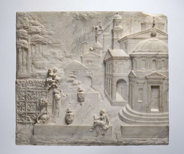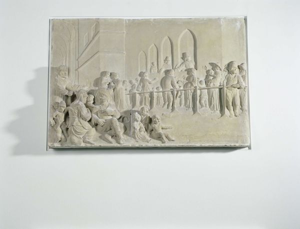 Curator: Just look at this frieze. It feels incredibly buoyant and almost... playful. It depicts children frolicking around a goat, and it's this muted beige tone. The artist clearly prioritized lightness. Editor: The playful quality resonates so clearly with its Rococo roots. This is "Children and Satyr Children Sporting with a Goat," created by Clodion sometime between 1776 and 1786. A period very defined by its decadence! Curator: Right, and considering Clodion’s favored medium—terracotta—the material choice itself contributes significantly to the artwork’s overall lightness. Think of the processes involved: the molding, firing, and careful finishing... These tactile methods speak to a direct connection with the earth, strangely grounding even fantastical scenes in everyday labor. Editor: Absolutely. We need to contextualize that labor. The piece’s escapism isn’t some innocent retreat. The opulent setting and abundance of putti speak volumes about the elite patronage driving artistic creation at that time. Isn't it fascinating how ideas of innocence and play are staged with such awareness, right before a time of revolution in France? Curator: I find it also compelling that terracotta, despite being more accessible than marble, was often employed for preliminary models. Its malleability offered artisans great freedom of expression as you say. Do you think of it more of a political model? Editor: I would definitely argue this composition operates within broader sociopolitical structures that legitimized its aristocratic vision. A satire about youth, maybe. While on the surface it’s playful and innocuous, the fact it's celebrating unadulterated frivolity when much of the country suffers hints at a more pointed allegory, a veiled critique. Curator: Or is it simply a desire for simpler times? One last bucolic expression before the world changes completely. Regardless, viewing it today, what does this sculpture say about the material culture and artifice of the late 18th century? What sort of legacy do the means and setting evoke? Editor: Precisely. I agree. I can’t help but see those frolicking children through a 21st-century lens.