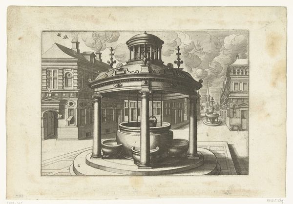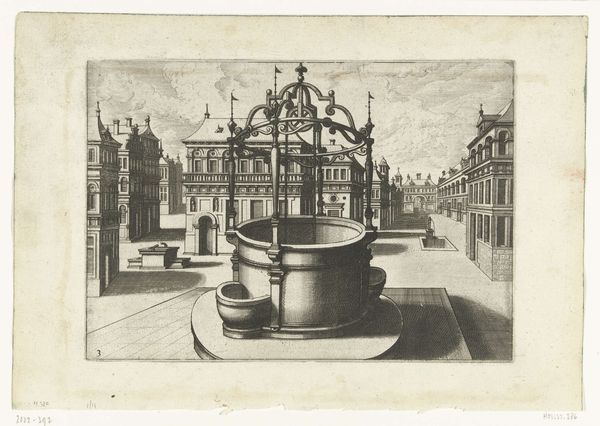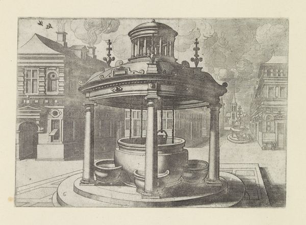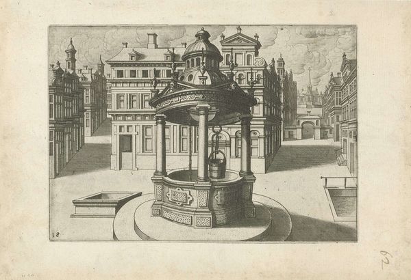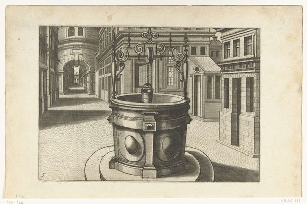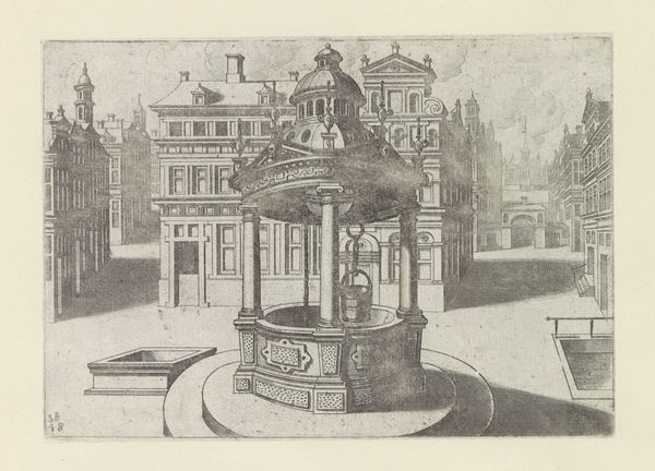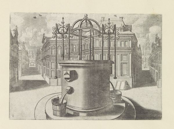 Curator: What immediately strikes me is the quiet stillness—a frozen moment in what feels like a very ordered, miniature city. The light and shadows give it this wonderfully melancholy air. Editor: It’s certainly a fascinating print. We’re looking at "Hoge ronde waterput met ijzeren ornamentale overhuiving en twee pompzwengels," which translates to "Tall round well with iron ornamental hood and two pump cranks," created around 1574 by Johannes or Lucas van Doetechum. Curator: A mouthful, that title! But accurate, I suppose. I keep coming back to how solid the well appears, juxtaposed against the delicacy of the etched lines everywhere else. Editor: Indeed. The production here reveals a keen understanding of materials and labor. Look at how the weight of the well contrasts with the almost lace-like quality of the ironwork. This suggests a complex relationship between necessity—water access—and civic pride displayed through ornate ironworking, which undoubtedly required skilled craftspeople. The print served as a visual record and a form of social documentation. Curator: I see it also as an architectural fantasy, the symmetry almost unsettling in its perfection. There’s a sort of…preoccupation with cleanliness and order. What’s most compelling for me, though, is that the water’s actually pouring, as captured in this very moment of flow—a sense of temporality, amidst all that meticulousness. Editor: Right. The distribution of water, the act of communal drawing…Water wasn’t merely a commodity, but a key component of public life and its distribution a concern for governance. The location, too, tells us this image speaks directly to how people interact within public squares, negotiating space and resources in an emergent urban environment. Curator: That makes me wonder who gathered there, near this grand structure. The etching implies an aspiration toward ideal community living, though, the figures absent make it quite uncanny. A longing perhaps more than representation. Editor: I agree that absence speaks volumes. By detailing these specific elements, from ironwork down to bucket size, the artist highlights the increasing complexity and material culture of urban life. Curator: Looking at this scene with all its layers, I find myself pondering: water—a fundamental need meets decorative metal. Art mirroring the social systems needed to meet our most vital material requirements. Editor: A final thought for me would be on how a seemingly mundane object has, through meticulous and skilled depiction, evolved into a lasting and captivating comment on society.
