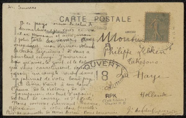 Editor: We're looking at a postcard titled "Prentbriefkaart aan Andries Bonger" by Emile Bernard, likely made before 1922. It’s ink on paper, so a drawing rather than a painting. My initial impression is that it is less of a finished work, more like a peek into the artist's correspondence, but also quite beautiful. How do you read this intimate form of communication? Curator: Exactly! It’s more of a shared moment than a performance. Postcards, then and now, have a whisper of immediacy. This one feels wonderfully lived-in; like catching a glimpse of Bernard deep in thought, quill in hand, sending a quick missive to a friend. What do you make of the contrast between the formal printed postal markings and his own, very personal, hand-written script? Editor: It's like two worlds colliding! There’s this standardized official form battling with something really intimate and, well, flowing, especially in the handwriting. Curator: Precisely! Bernard's calligraphy – almost a drawing in itself – feels like a secret language layered onto the public declaration of "Carte Postale." He takes something meant for mass communication and twists it into a highly personalized form. The stamp, the postmarks—they’re all part of the composition, almost like collage elements in an intimate piece. Editor: So, even mundane things like stamps can actually contribute to a richer experience. It definitely gives me a lot to ponder about my own methods of communications today! Curator: They do! Everything has potential to inform how we perceive or wish to be perceived; like choosing between the swift message of an email versus putting pen to paper, sending a letter to a friend. And that reflection can also provide a great context in the art world!