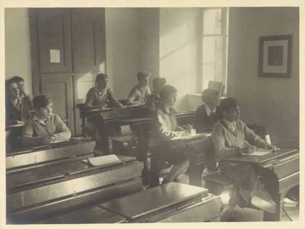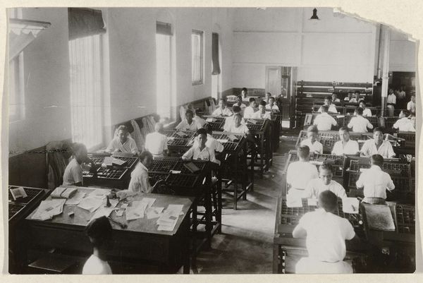 Editor: This gelatin-silver print, titled "Personeel van de Indië-lijn in een werkkamer," is from around 1930 to 1940. It depicts a room full of office workers. There is such a somber atmosphere! What do you make of it? Curator: What immediately strikes me is how this image encapsulates the machinery of colonialism. Look at the vastness suggested by the bank of windows – the supposed ‘openness’ onto the world, contrasted with the regimented, almost oppressive interior. What power dynamics are at play here? Editor: Power dynamics? In an office scene? Curator: Consider the "Indië-lijn," the shipping line to the Dutch East Indies – now Indonesia. This photograph isn't just about an office; it's about the infrastructure that facilitated and sustained colonial rule. The employees are quite literally cogs in a machine that connected the colonizer to the colonized. What stories might those individuals hold, working in such a system? Editor: So, you’re saying the image isn’t just a neutral record, but an implicit statement on colonialism? I hadn't thought about the ethics involved here. Curator: Precisely. The photograph’s sharp detail almost fetishizes this ordered, bureaucratic space. This, in itself, can be seen as an endorsement of colonial efficiency, whilst completely erasing the experiences and perspectives of those who were subjected to it. It raises the question: whose narrative does this image ultimately serve? How can we re-read this photograph against the grain? Editor: That’s a really powerful perspective. I was just looking at it as a historical snapshot, but you’ve made me think about the layers of power embedded within. Thank you! Curator: My pleasure! Hopefully, this helps everyone look beyond the surface and recognize the critical importance of understanding historical and societal contexts in art.