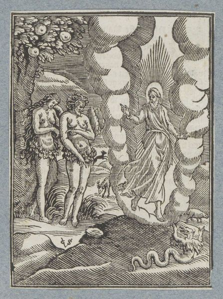 Curator: This intriguing ink drawing, "Adam, Eve, and Death," by Christoffel van Sichem II, made around 1645, certainly holds a potent scene. It's currently residing here at the Rijksmuseum. Editor: My first thought is the sheer bleakness. Even in this tiny scale, the artist achieves such a heavy feeling of loss. The stark contrast between the black ink and the pale figures is especially affecting. Curator: Precisely. Consider the context of its making – the Dutch Golden Age, rife with Calvinist sensibilities and anxieties around morality. The stark use of line, achieved with the pen, underscores that very austere mood, and remember this piece isn't monumental; its power lies in its intimacy and precision of production. Editor: Absolutely. Death is portrayed traditionally, yet its positioning feels secondary to the posture of Adam and Eve; their downcast gaze towards the death itself tells a very evocative tale. There is the cultural knowledge here – about their culpability. Curator: Notice how van Sichem's technique contributes to this allegory of loss. The intricate cross-hatching used in the rocks and trees provides not just form, but also textures – material and psychological that convey this difficult situation that has impacted all human labour since the fall. Editor: Yes, and there's a deliberate visual language at play. The serpent entwined near Eve echoes the classical imagery of temptation, while Adam wielding the shovel signifies their new toil after expulsion from Paradise, no longer carefree inhabitants of the Garden of Eden. The image creates, then, a clear narrative arc, embedded in Christian art. Curator: In essence, Van Sichem’s work embodies the shifting cultural landscapes of labour during this early Capitalist period, through allegorical subject matter and the means of production using something as rudimentary as pen and ink. Editor: It really illuminates how the same archetypal story can be continually reinterpreted, filtered through the values and visual lexicons of its own time, as we all attempt to come to grips with morality and our fragile existences. Curator: A very poignant conclusion. This drawing gives us a stark understanding of both early capitalist anxieties, and a human story we’re always going to continue to repeat. Editor: Indeed. I’m leaving with a renewed sense of wonder, a new visual perspective on how artists transform raw ideas into lasting icons.