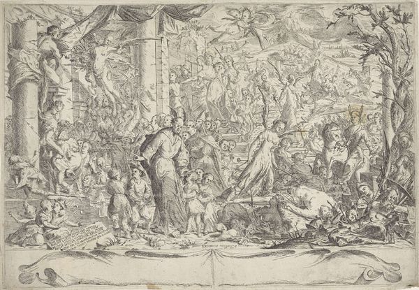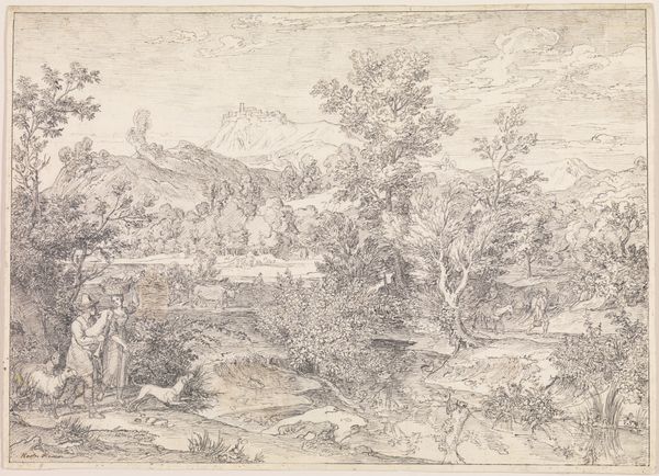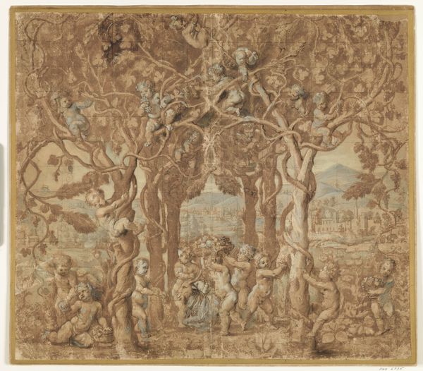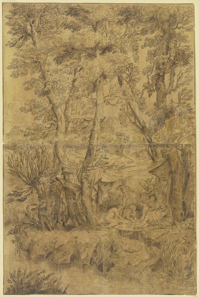 Curator: The ink and pen drawing before us is entitled "Ornamental Theater Scene with Trees," created sometime in the 17th or 18th century. It's currently held here at The Metropolitan Museum of Art. Editor: My first impression is… theatrical, obviously! The stark ink wash and delicate pen work creates this slightly unsettling, dreamlike battlefield. It has a strangely ornamental quality as if war could be aesthetically pleasing or at least elegantly staged. Curator: Exactly. The baroque love for grandeur is unmistakable, but also consider the political context of imagery. Drawings such as this, produced by anonymous hands, were often used for propaganda, framing narratives of conflict for public consumption. The scene is a meticulously crafted spectacle. Editor: A spectacle designed, it seems, to desensitize us to the very real human suffering on display. Look at those bodies strewn across the foreground! Their anonymous positions underscore the brutal consequences of conflict—the disposable nature of those who fought and died, with little impact on who makes or benefits from the outcome. The distance created through a drawing of this scale feels deliberate, masking any sort of actual, lived horror from the comfort of the audience's eyes. Curator: It is intriguing how the scene depicts a decisive moment within what we might assume is the peak of battle, or at the moments after where casualties can be observed as part of the experience, an aesthetic appreciation in a space meant for it, making visible that those on display matter little outside that representation. Editor: Indeed, what does this ornamental approach tell us about the era's relationship with violence? About who got to define the narrative and how this type of romanticisation contributes to the marginalisation, for example, the indigenous population during a war scenario. Curator: Absolutely. And it begs the question, what purpose did these drawings serve, other than to reinforce existing power structures? Editor: For me, reflecting on the historical contexts woven into "Ornamental Theater Scene with Trees," challenges us to critique how spectacle and artistic representation can serve both as powerful tools of authority and potential sites of dissent. Curator: Precisely. It allows us to question whose stories are told and how history is actively shaped by these visual records. Editor: And hopefully prompting each of us to look a little closer, think a little deeper about whose voices aren't being heard, or actively omitted, in grand presentations of war.