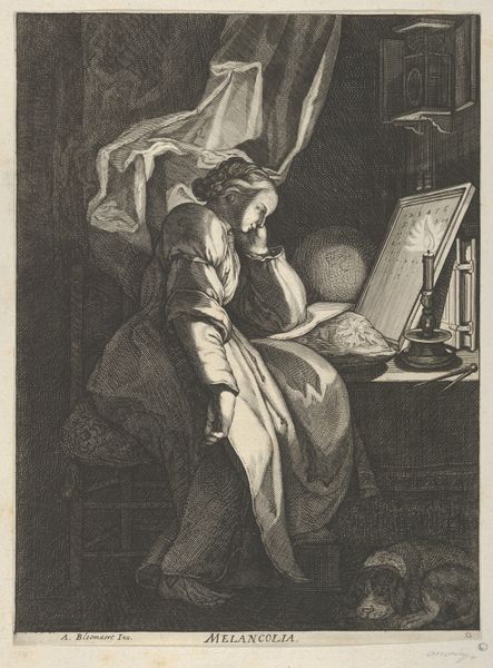 Daniel Nikolaus Chodowiecki created this image, "The Voyage to Paris," using etching techniques. Immediately, the detailed and structured nature of the lines draws the eye, creating a sense of intimacy within this domestic scene. The composition is built around a stark contrast between light and shadow, further enhancing the emotional depth of the interaction between the figures. Chodowiecki’s structural use of light to define form and space here is particularly interesting when examined through a semiotic lens. The lighting not only illuminates the central figures but also casts long shadows that suggest a world extending beyond the frame. The arrangement of figures, with their gestures and interactions, speaks to the cultural codes and social dynamics of the 18th century. Note how the linear precision, a formal quality characteristic of Chodowiecki's style, is employed not merely for aesthetic purposes but to evoke an intellectual and emotional understanding of the scene. This etching serves as an ongoing site for historical and artistic interpretation.