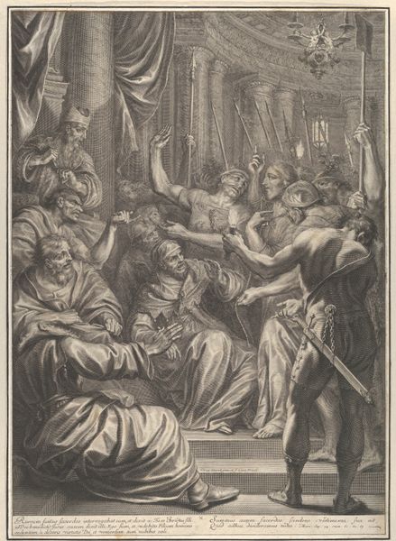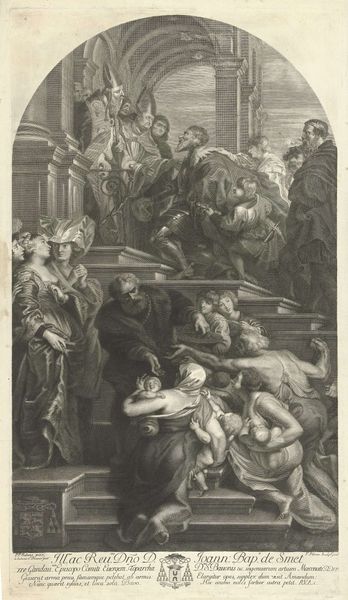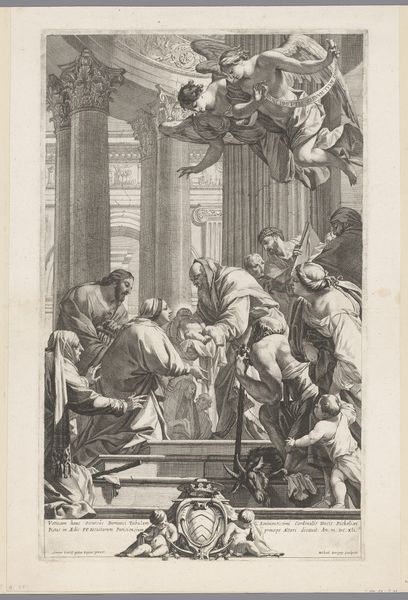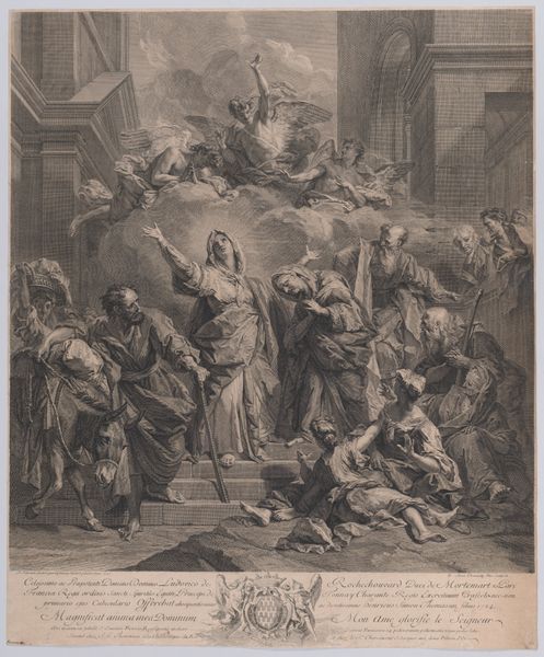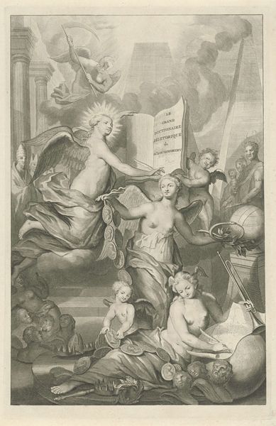 This allegorical print by François Chauveau, created without a specified date, presents a complex interplay of figures rendered in fine lines. The monochromatic palette emphasizes form and the drama of the scene. A central female figure holds an open book, while allegorical figures surround her in a dynamic composition that captures the viewer's attention. The print employs a classical visual language, yet subverts traditional notions of order. The figures are arranged in a non-hierarchical manner, suggesting a disruption of conventional power structures. The artist's rendering challenges our expectations of allegory. It reflects an emerging interest in the destabilization of established meanings. The detailed linework and the symbolic representation of figures function as semiotic codes, which invite us to decipher the underlying meaning. Chauveau uses these elements not just for aesthetic purposes but to engage with broader philosophical questions about knowledge, history, and representation. The print serves as a site of ongoing interpretation, reflecting the dynamic nature of art and its capacity to provoke thought.