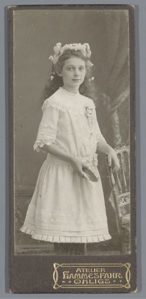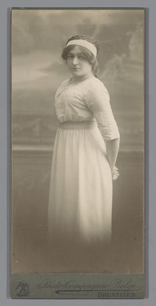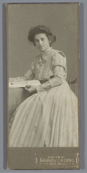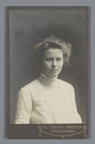 This is a photographic portrait of an unknown young woman, made by Atelier Prinses in Amsterdam. The photographic print is small, only about 13cm high, which was typical for cartes de visite—calling cards that became a popular form of social currency in the late 19th century. The albumen print, created using a process developed in 1850, gives the image its distinctive sepia tone. Paper coated with albumen, or egg white, creates a smooth surface for the photographic emulsion. The process involves skilled darkroom techniques and chemical treatments, combining artistry with industrial methods. The result is a sharp, detailed image capturing a moment in time. Consider the social implications of this technology. Photography democratized portraiture, making it accessible to a wider segment of society beyond the elite. While Atelier Prinses was a commercial studio, the creation of such portraits also provided employment opportunities, reflecting the changing landscape of labor and class in the burgeoning age of mass media. This image is not just a record of a person, but also of a society grappling with new technologies and social norms.