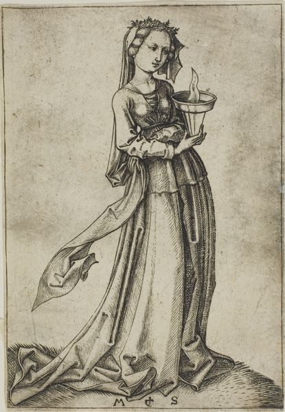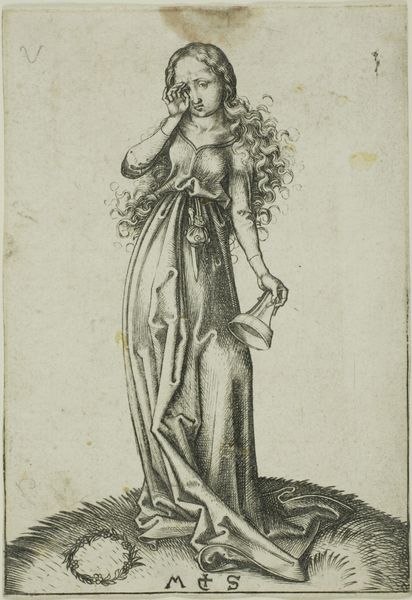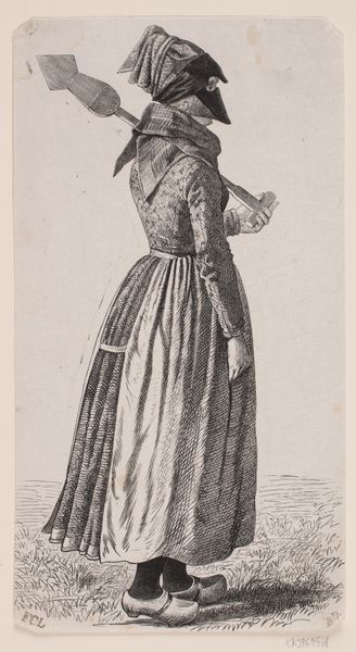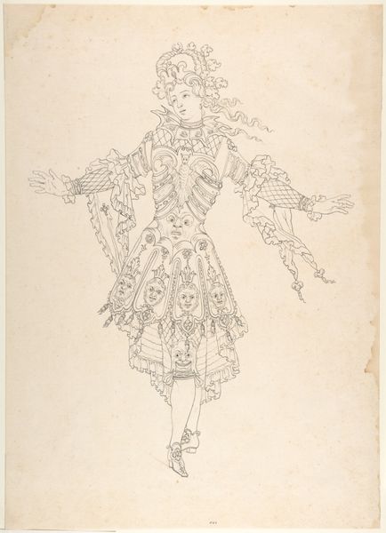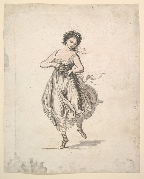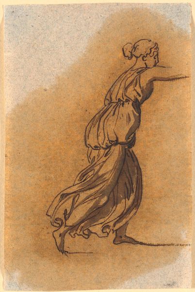 Curator: This ink drawing, titled "Frigga, g\u00e5ende, med et par h\u00f8ge p\u00e5 de udstrakte arme. Samt nogle linjer med kunstnerens notater," presents the Norse goddess Frigga, depicted by Nicolai Abildgaard, a key figure of the Danish Golden Age. Abildgaard completed it sometime between 1743 and 1809. Editor: It strikes me as a very deliberate and perhaps a somewhat archaic figure. Her pose is static, almost regal. I’m immediately drawn to the stylized clothing. It feels staged, consciously posed, even a bit stiff. Curator: That "stiffness" you observe ties directly into the neoclassicist aesthetics that dominated the late 18th century. Abildgaard was instrumental in bringing these aesthetics to Denmark, drawing on Greek and Roman ideals in art and philosophy, especially as applied to his renderings of Norse mythology. Frigga, here, isn't just a goddess, but an emblem of virtue, wisdom, and foresight. Editor: The inclusion of what appears to be alchemical symbols across the dress does a lot to ground those intellectual and historical associations within more occult contexts. Were those notations part of his approach to Romanticism? Curator: Indeed, and these symbols mark Abildgaard’s personal flair to romanticism. As neoclassicism waned, a parallel shift toward romanticism started in the 19th century. Editor: So we have Frigga holding hawks in either outstretched arm with text along the bottom edge. How should we read these elements? Curator: We see not just Frigga, but a kind of commentary or study – which Abildgaard clearly saw fit to unite within one picture. Frigga is, after all, goddess of prophecy. In this way, it invites us to ponder our place and fates, so relevant during times of both enlightenment and revolutionary fervor. Editor: It certainly makes the work resonate differently to consider its historic value in terms of how to reconsider that time. Overall, I appreciate the level of study that it seems to depict between classical ideals and romantic mysticism.