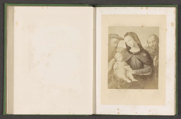 This is a photograph by Joseph Cundall, made sometime in the 19th century. It reproduces an engraving by Richomme of Raphael’s painting “The Holy Family of Francis I.” Notice how Cundall’s image, printed in shades of sepia, is arranged within the book's rigid structure. The composition, with its tight framing, draws our eye to the intimate scene of the Holy Family. Forms are rendered through tonal gradations rather than stark lines. The composition invites us to meditate on themes of family, divinity, and artistic legacy. Consider how photography, as a medium, alters our perception of the original painting. No longer do we have Raphael’s vibrant colors and textures, but a monochromatic interpretation. Cundall's photograph operates as a sign, pointing back to Raphael's original work, yet bearing its own distinct aesthetic and historical markings. It prompts a reflection on how meanings transform across different media and eras.