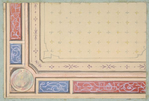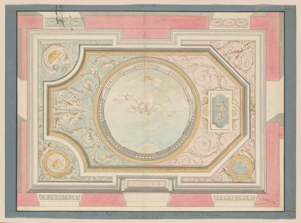 Jules-Edmond-Charles Lachaise drafted this ceiling design with pen and ink and watercolor on paper. Notice the fleur-de-lis pattern filling the design. This symbol, representing a stylized lily, served as a powerful emblem for French royalty, signifying purity and association with the divine right to rule. Yet, its roots stretch back further, appearing in ancient art across various cultures, linked to concepts of fertility and regeneration. Consider how the fleur-de-lis also emerges in religious contexts, symbolizing the Virgin Mary and the Holy Trinity, reflecting a sublimation of its earlier, more earthly associations. These motifs engage viewers on a subconscious level, evoking deep-seated emotions and cultural memories. This symbol's journey through time shows its capacity to adapt and be reborn, embodying new layers of meaning while retaining echoes of its past. It is this cyclical pattern of symbolic death and rebirth that characterizes the life of images across time.