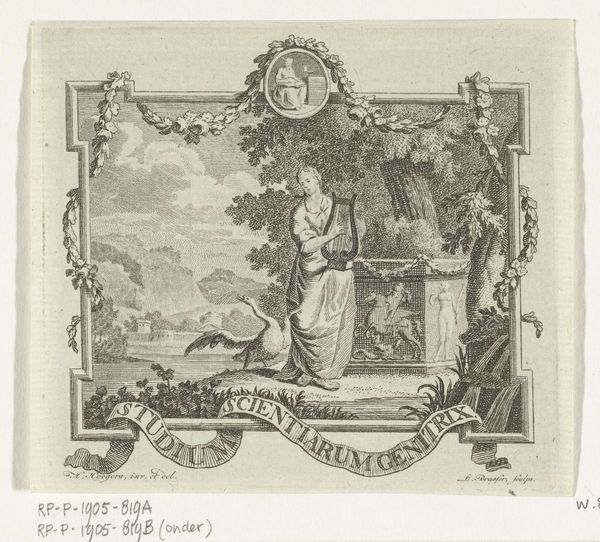Leendert Brasser created this vignette with poetry using etching in the late 18th century. This artwork is titled "Vignet met Poëzie met lier en zwaan in landschap met omlijsting," which gives us clues about its social and cultural context. The presence of the lyre, swan, and idyllic landscape reflects the Neoclassical movement sweeping Europe at the time. It was a period that favored reason, order, and a revival of classical art and literature. Made in the Netherlands, the image reflects the cultural values of the Dutch Republic, which emphasized education, scholarship, and artistic expression. Institutions like the university at Leiden helped to foster such a cultural climate. Historical research into the cultural and intellectual life of the Dutch Republic would help us to understand this artwork and its meaning.