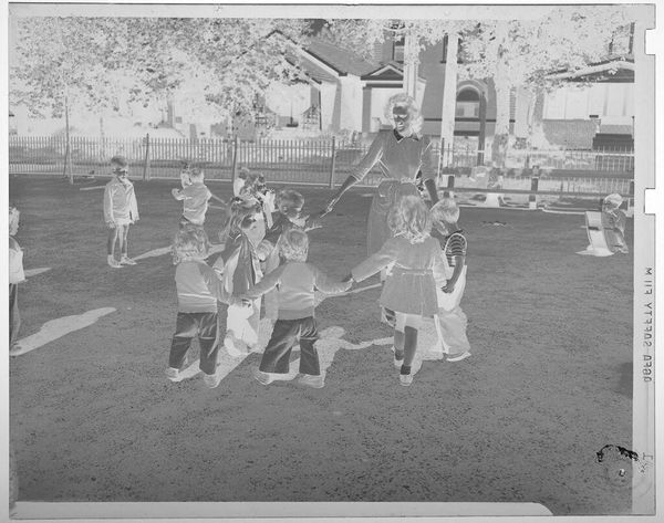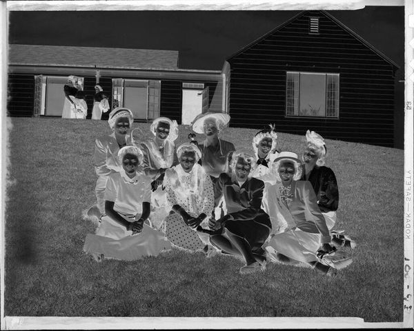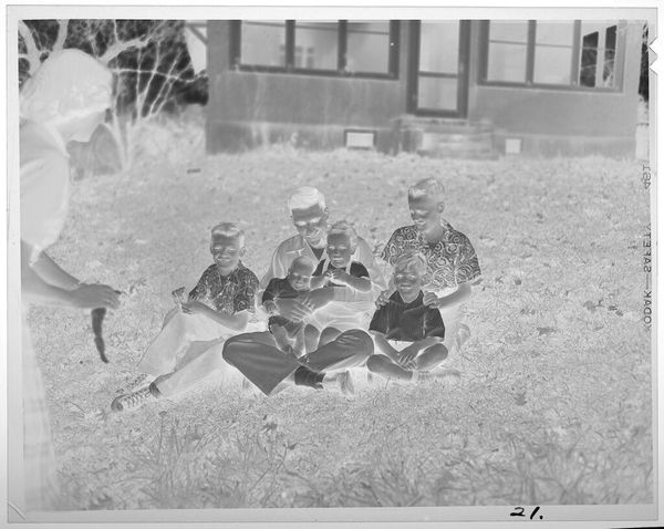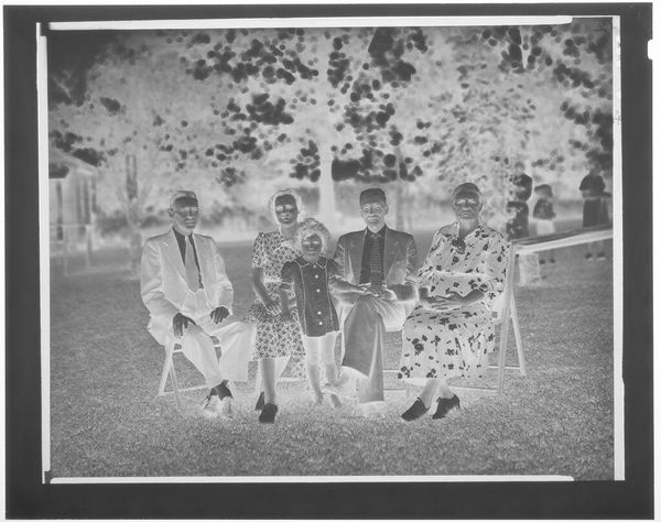 Editor: This photograph by Hamblin Studio is titled "Untitled (group of aproned girls in field)." The girls' dresses create strong geometric forms. What do you see in this piece, from a formal perspective? Curator: The composition employs a clear structure, dividing the subjects into distinct planes. Note how the dark aprons contrast with the lighter background, creating a rhythm across the image surface. The texture of the field itself contributes to the overall pattern. Editor: It’s interesting how the negative print emphasizes the shapes, almost abstracting the figures. Curator: Precisely. The reversal of light and shadow foregrounds the materiality of the photographic process itself, drawing attention to the medium as much as the subject. What do you think about the arrangement of the subjects themselves? Editor: I see how the symmetry, while not perfect, adds to the formal quality. I appreciate the focus on shape and form over narrative. Curator: Indeed. Hamblin Studio prioritizes the visual language of photography itself.